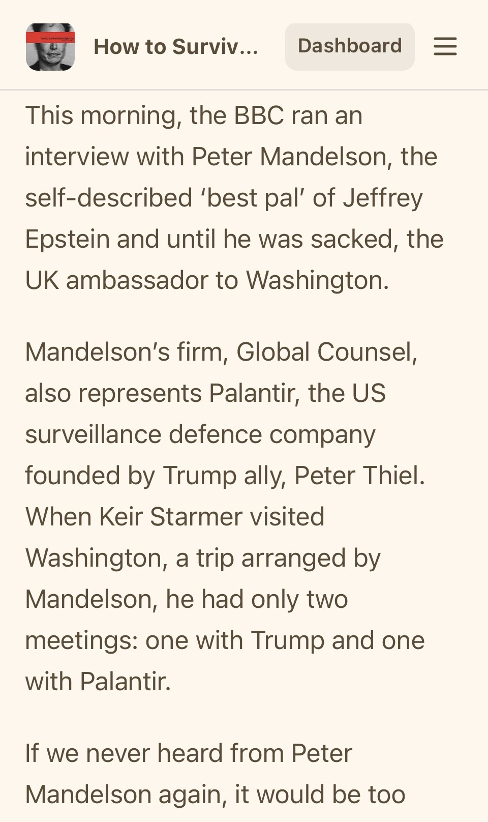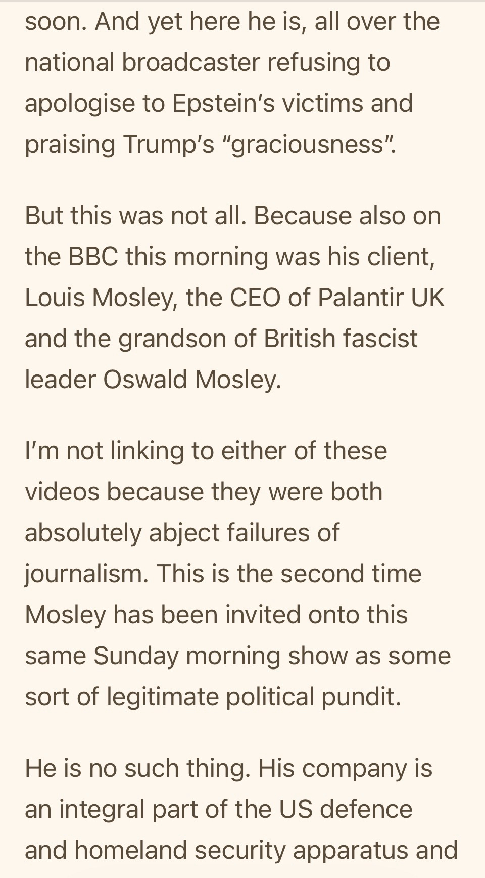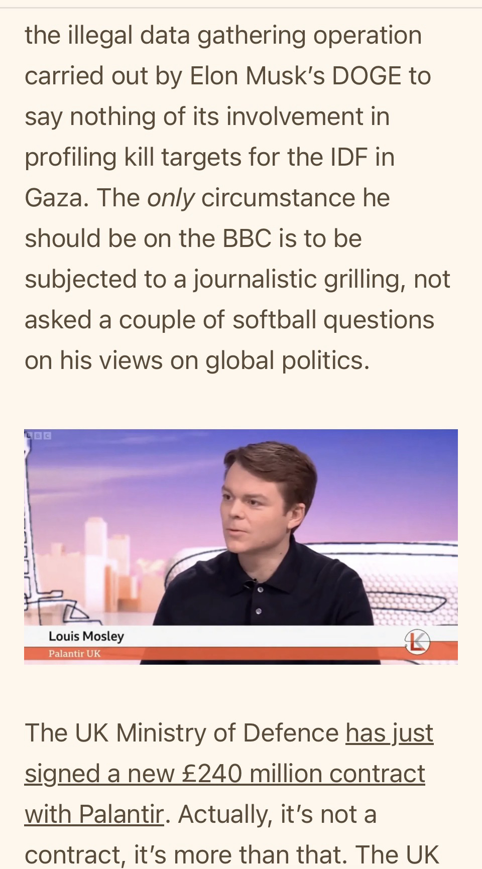 Since #bbclaurak is trending, let’s remind ourselves that ONE MONTH ago, the BBC invited Mandelson on for a soft-ball interview on her show. While HIS CLIENT , Palantir’s Louis Moseley appeared as a pundit Both, as I wrote at time, were ‘abject failures of journalism’ 1/