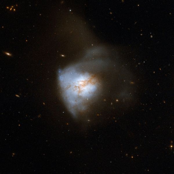 Arp 220 is the aftermath of a collision between two spiral galaxies. The collision set off a burst of star formation, creating star clusters seen as bluish-white bright knots in this image.