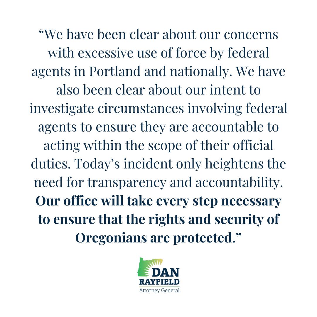 "We have been clear about our concerns with excessive use of force by federal agents in Portland and nationally. We have also been clear about our intent to investigate circumstances involving federal agents to ensure they are accountable to acting within the scope of their official duties. Today's incident only heightens the need for transparency and accountability. Our office will take every step necessary to ensure that the rights and security of Oregonians are protected."