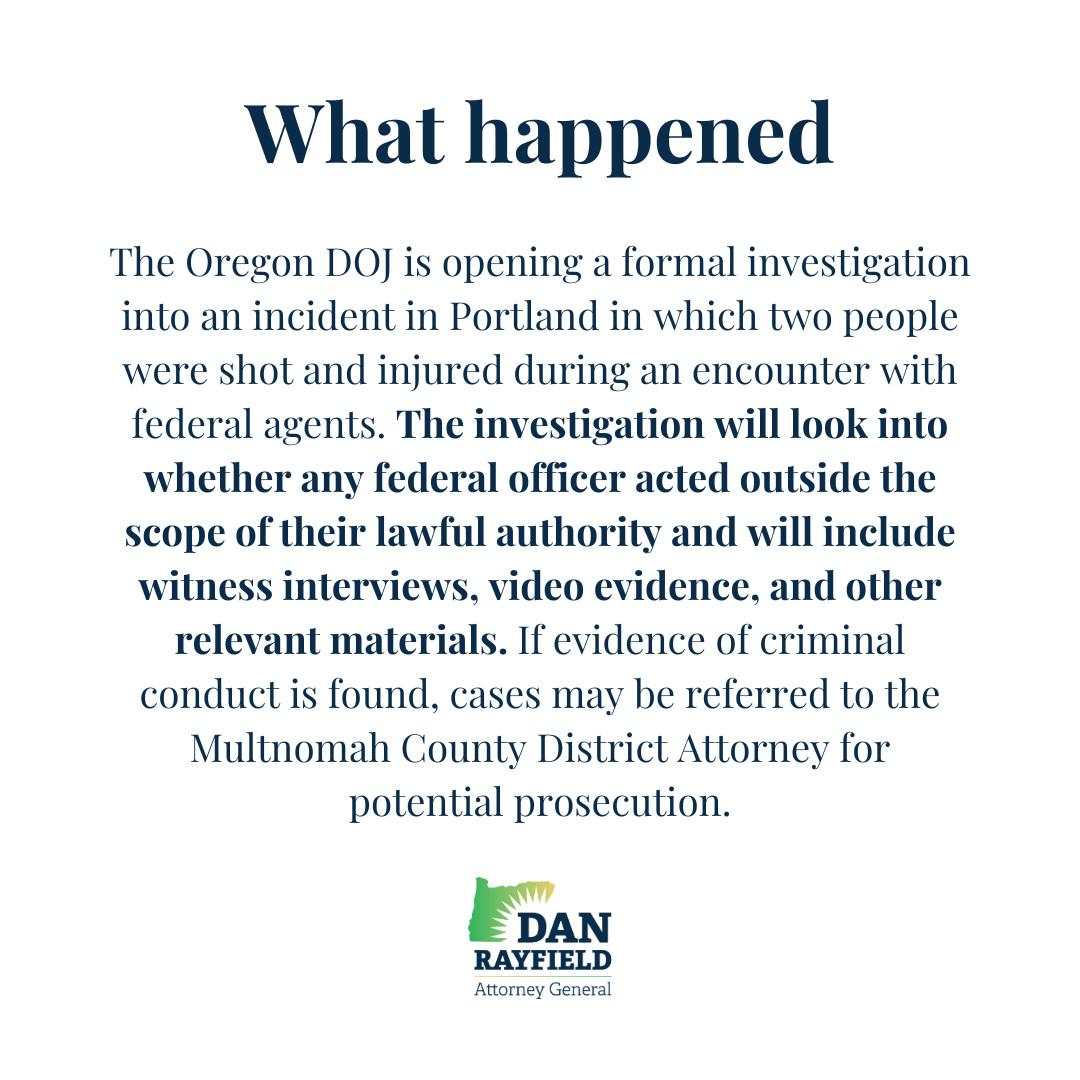 The Oregon DOJ is opening a formal investigation into an incident in Portland in which two people were shot and injured during an encounter with federal agents. The investigation will look into whether any federal officer acted outside the scope of their lawful authority and will include witness interviews, video evidence, and other relevant materials. If evidence of criminal conduct is found, cases may be referred to the Multnomah County District Attorney for potential prosecution.