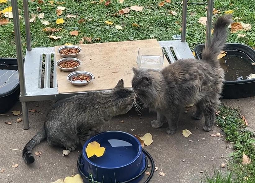 Nose boops by the water bowl! #SpookyKittiesFerals #FeralCats #Caturday #cats #Caturday #CatsOfMastodon #CatsTodon #MastoCats #CatsOfFediverse