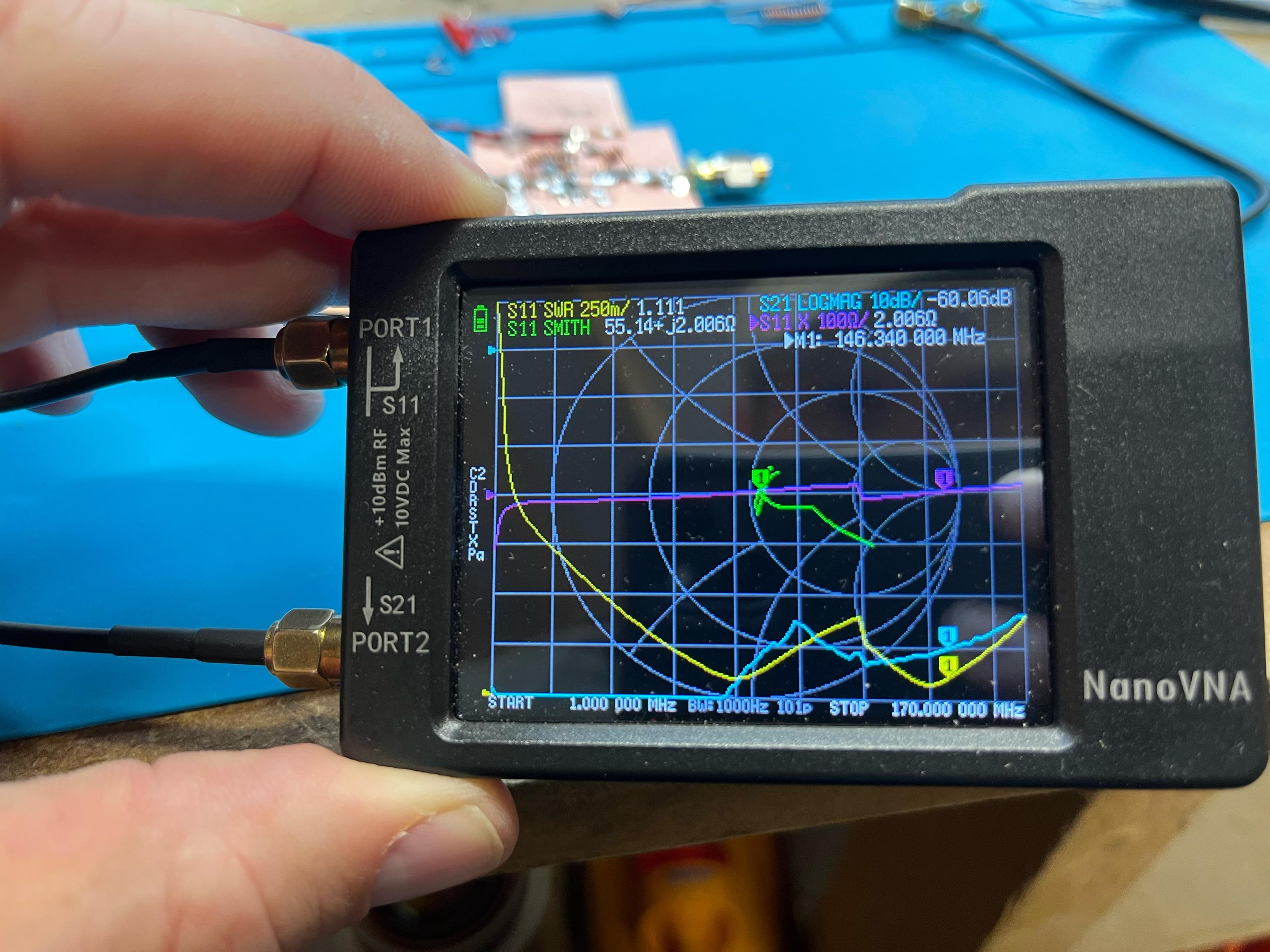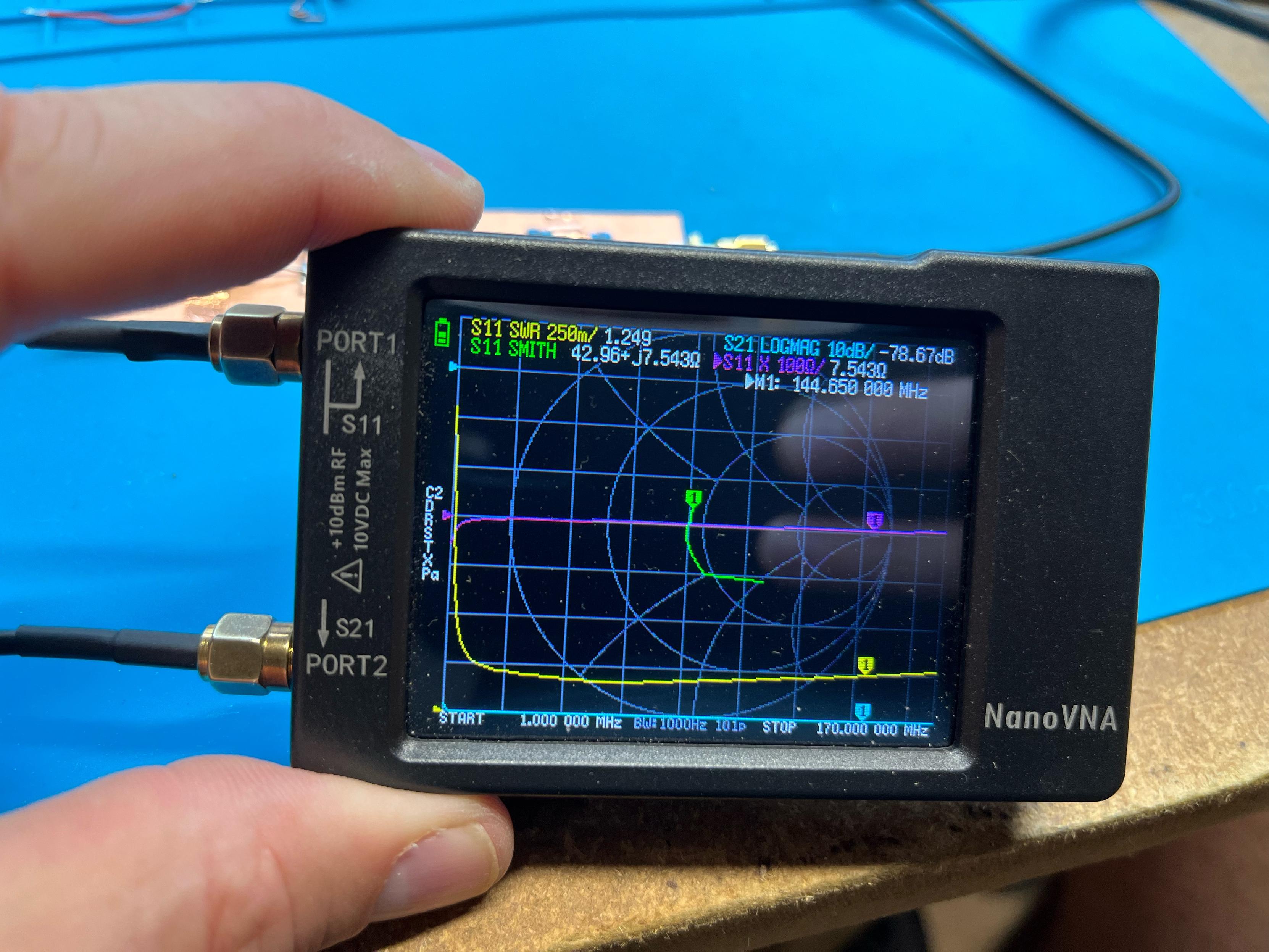 Messing around with making inductors for a 2m band pass filter and measuring them with the NanoVNA. I made an OK-ish fixture with some RG-316, SMA connector, and alligator clips, and calibrated it with the fixture attached. Getting pretty close to the 100nH I need for these! #HamRadio #AmateurRadio