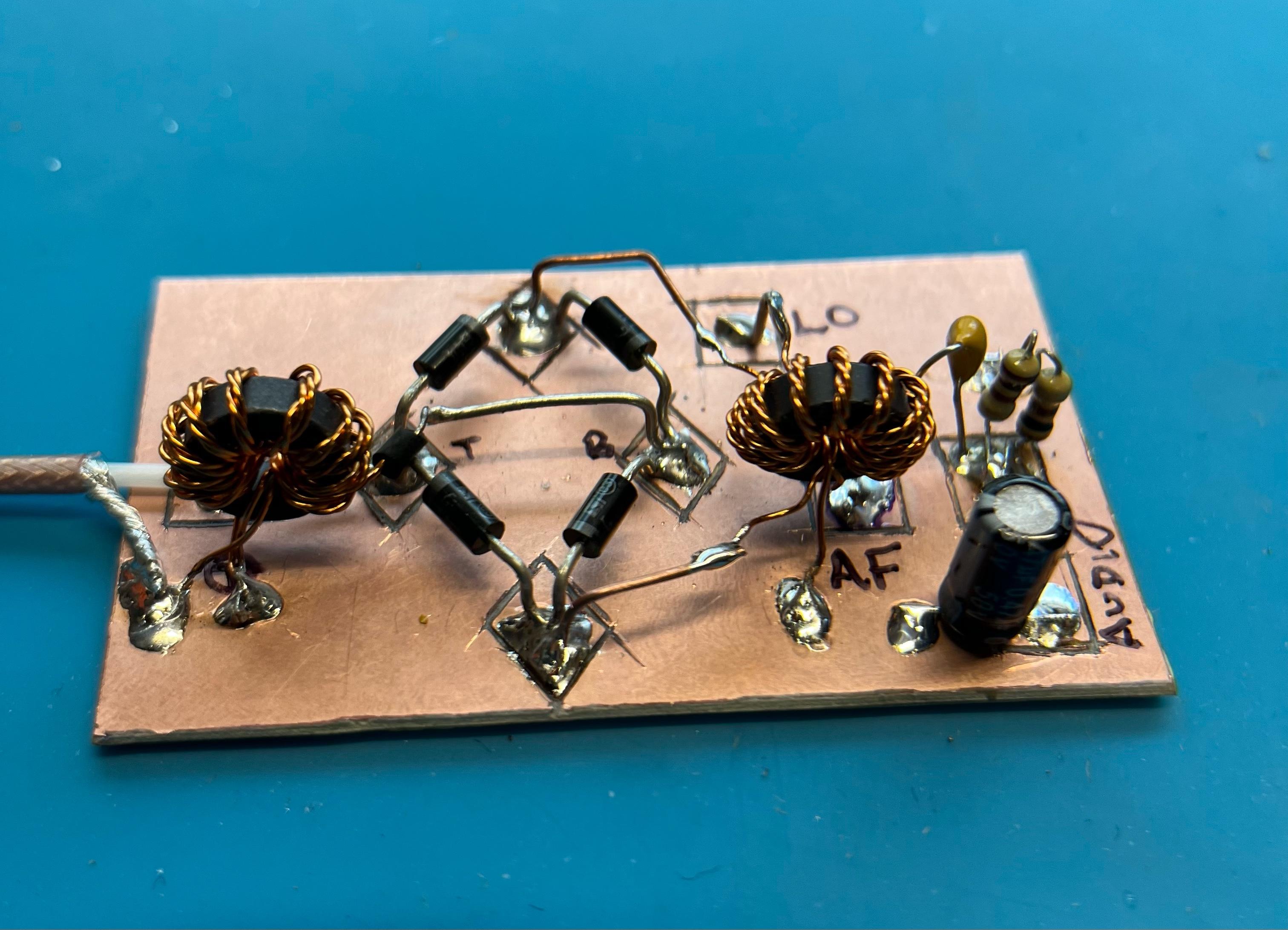 Mixer and audio amp work! Don’t have the rest of the Soldersmoke direct conversion receiver done yet. But I used the digital VFO for my 2m radio homebrew project to feed the LO port on the mixer. Used my 2m FM HT to give some signal toward the exposed end of the coax. At first I heard just screeching. Then realized one side of one toroid was backward phase. Fixed that and could hear myself on the speaker! 🔊 #HamRadio #AmateurRadio