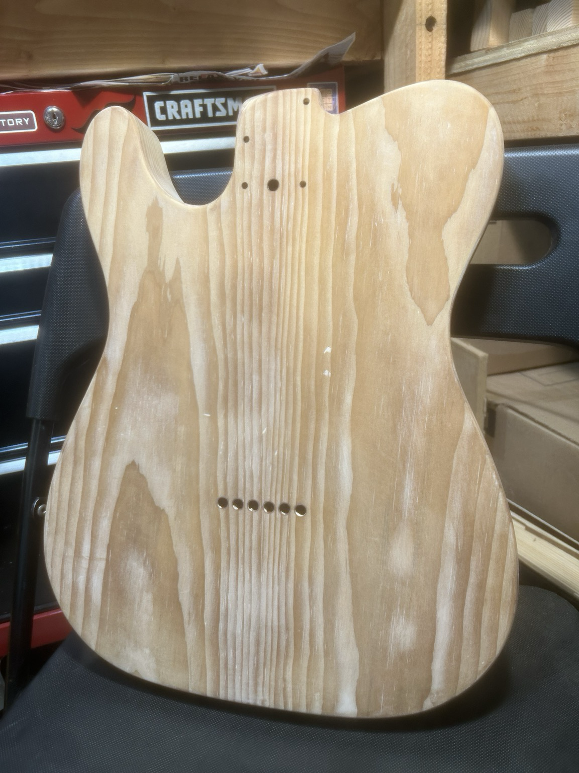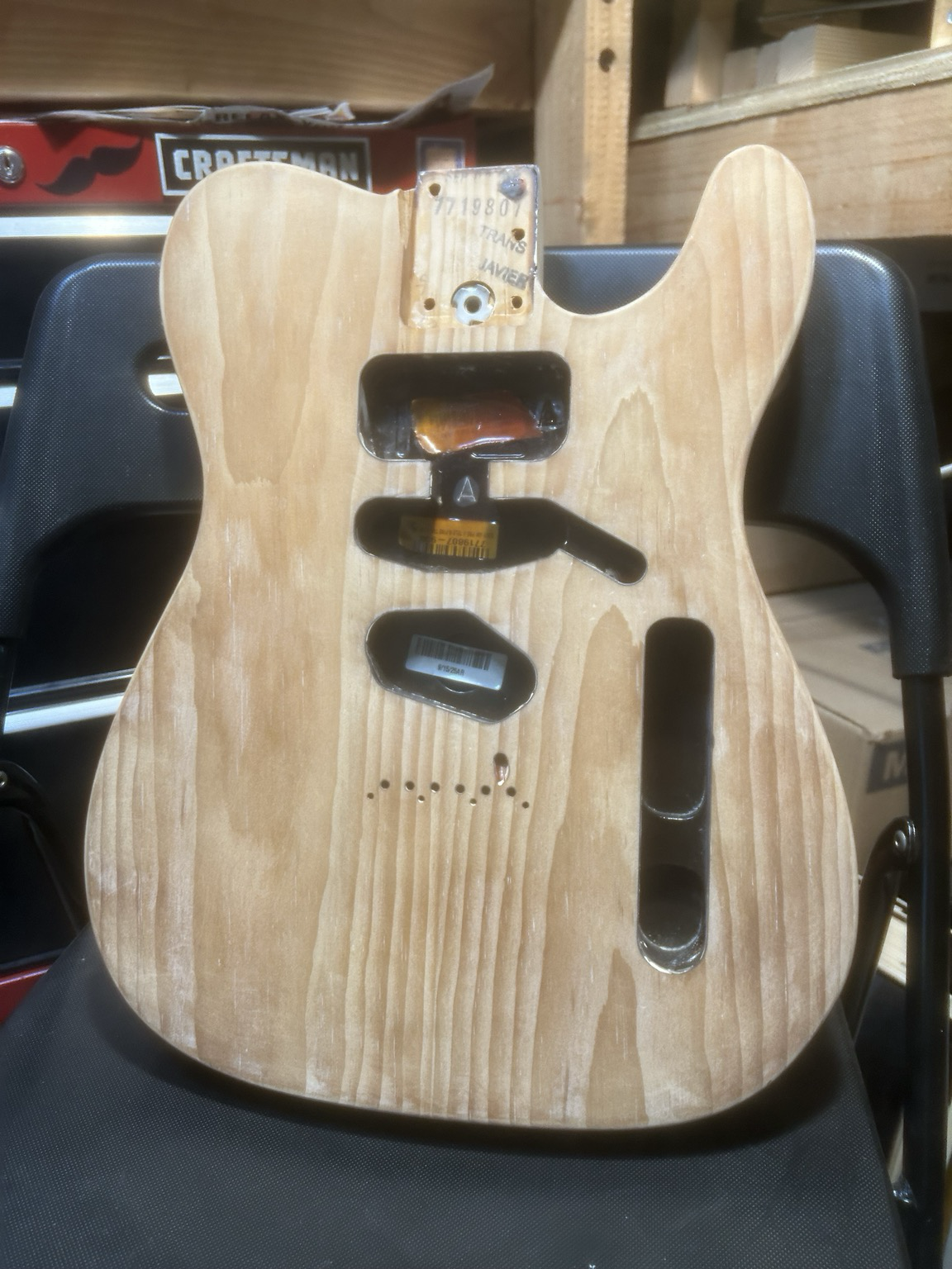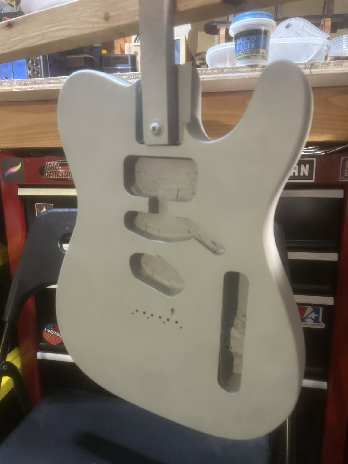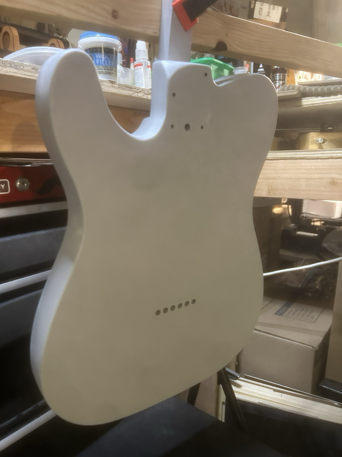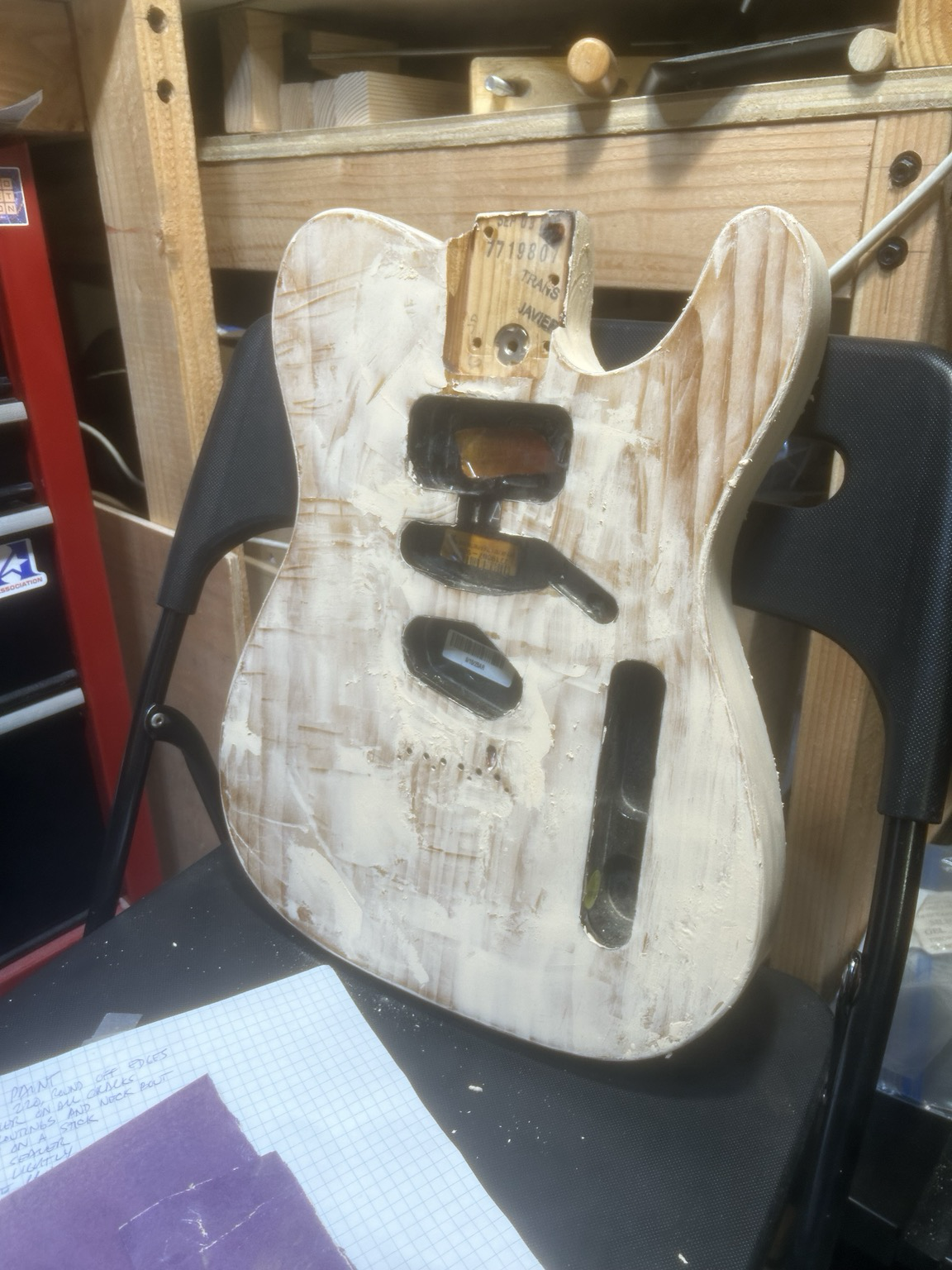 Filler sanded off, soon to mask the cutouts and prime with gray primer which will show all the surface defects I missed that will need another pass. Sure glad I sanded it outside, that was dusty! #gearsquad #guitar #painting #telecaster #MastoArt