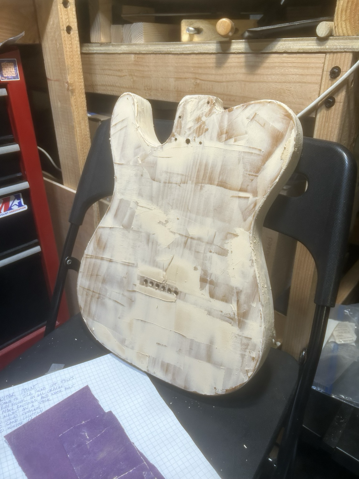 Guitar is sanded and edges rounded, sealed and filler applied - the wood has lots of little cracks along the grain, and I like a very smooth surface for Geometrons. #gearsquad #guitar #painting #fender #telecaster #MastoArt