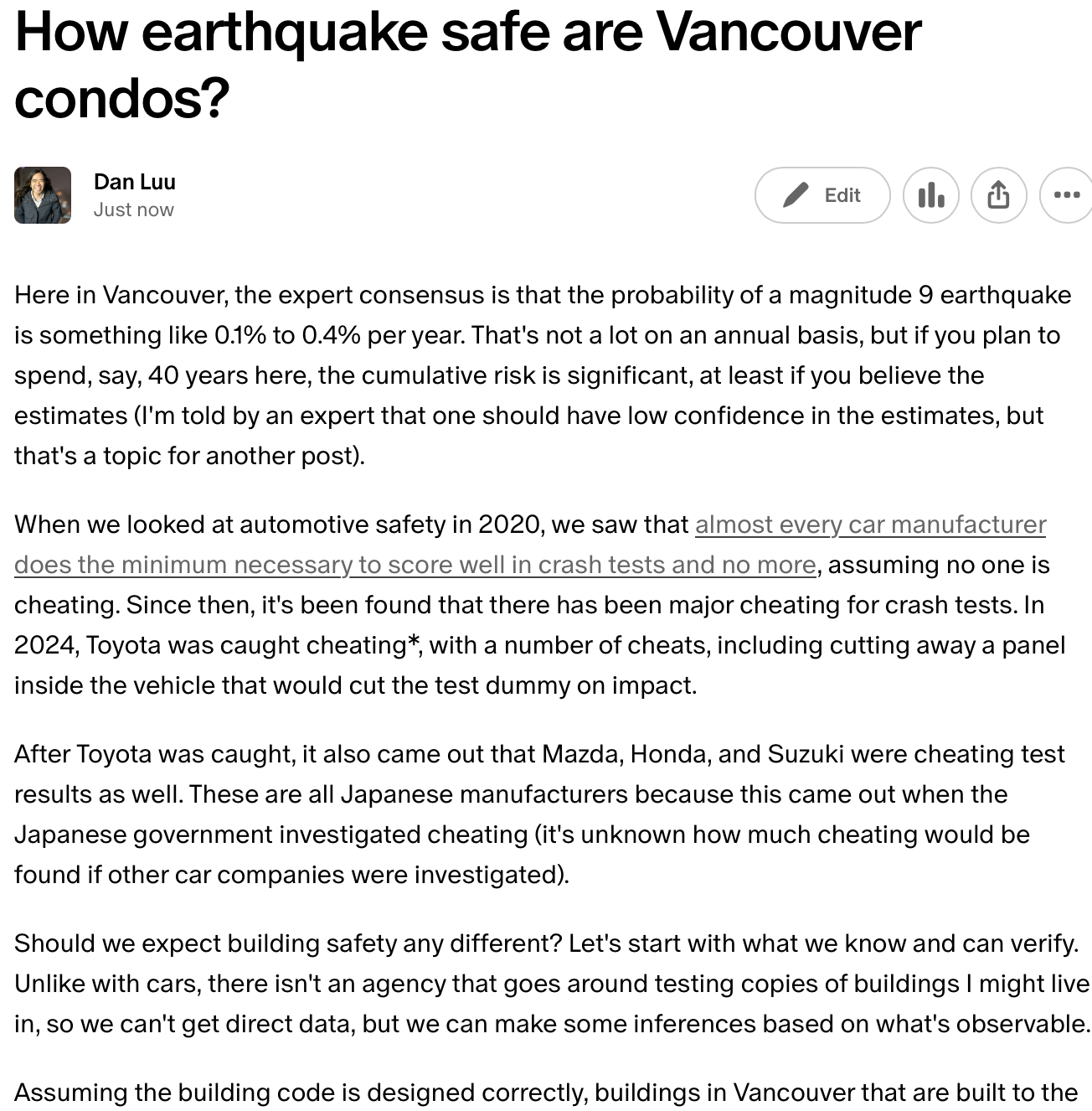 @danluu there are some great studies on building demolition where they put dummies in different places and then assess how well they did post demolition. IIRC being next to things >> under things (between beds, not under tables). The #sfba has earthquakes just enough that we do something about it. I worry about the other parts of the whole west coast, b/c the risk seems to be similar but kind of understandably it's harder to motivate people to deal with hypothetical risks. #earthquake
