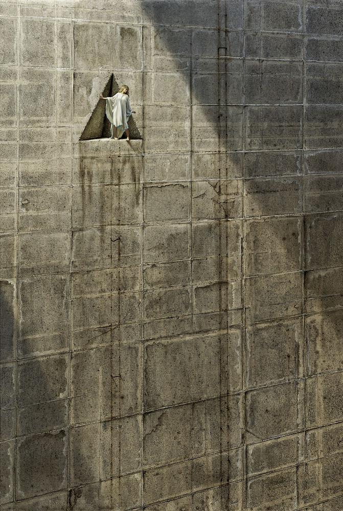 At times the light of knowledge seems to only illuminate the negative side of our existence and becomes a burden to the spirit. He is considering letting it go—"ignorance is bliss"—as he makes his difficult journey towards the light of the sky far, far above.