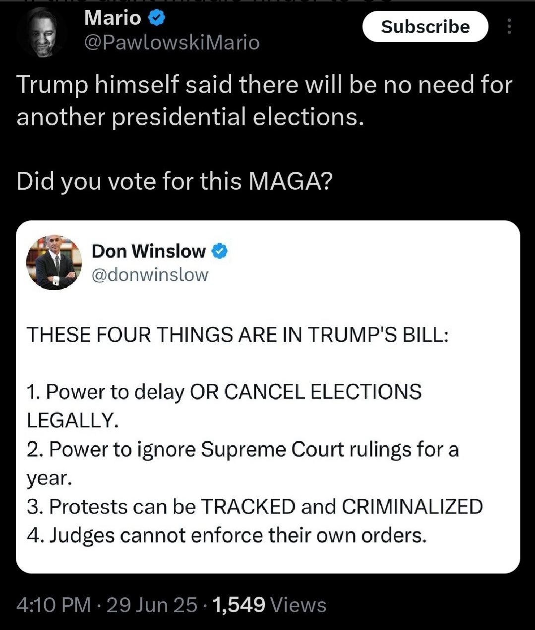 This? Is a GIANT middle finger to US #democracy. If they pass it, your elections can just be canceled, he'll criminalize protests within a months waiting for ANY #SupremeCourt ruling enforcement to ATTEMPT to stop it