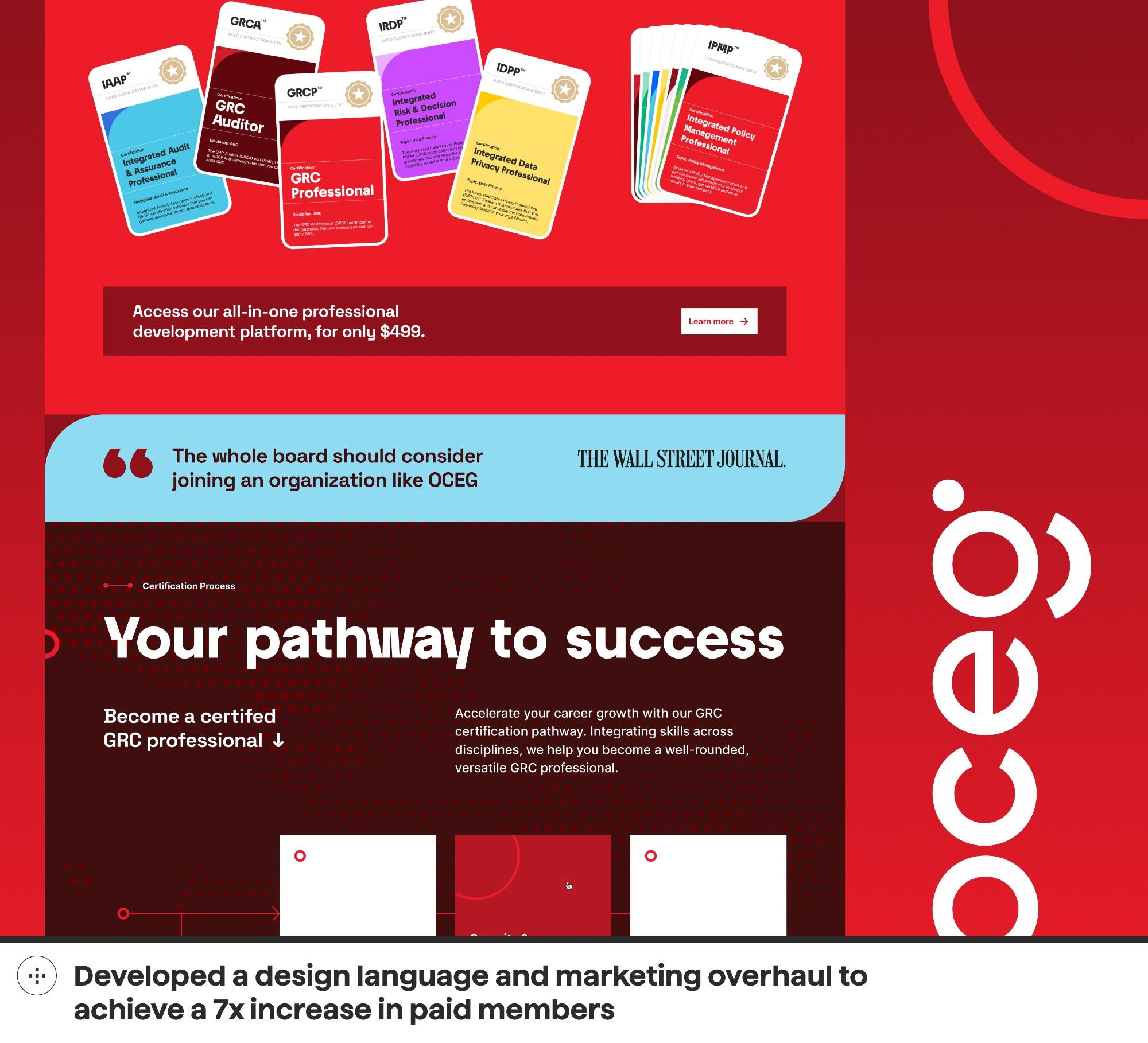 A composition of selected elements from the OCEG website, featuring bold typography, certification cards, and a structured career pathway for becoming a GRC professional. The design uses a striking red colour scheme with modern layouts. The caption reads “Developed a design language and marketing overhaul to achieve a 7x increase in paid members”