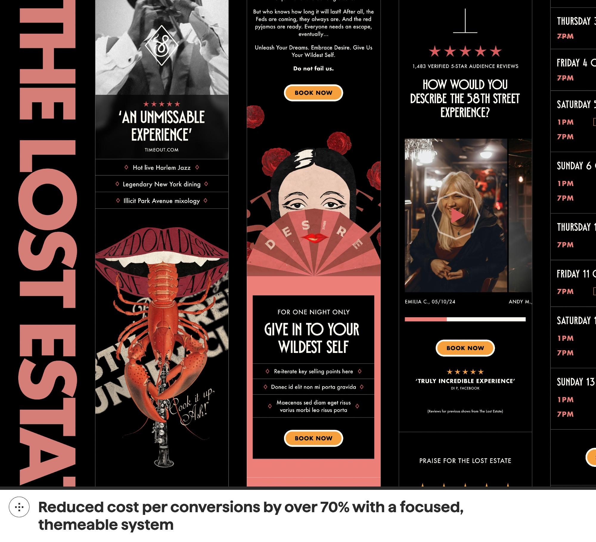 A composition of selected elements from “The Lost Estate” website, featuring bold typography, vintage-inspired illustrations, event details, customer reviews, and booking buttons. The design uses a dark theme with red and gold accents. The caption reads “Reduced cost per conversions by over 70% with a focused, themeable system”