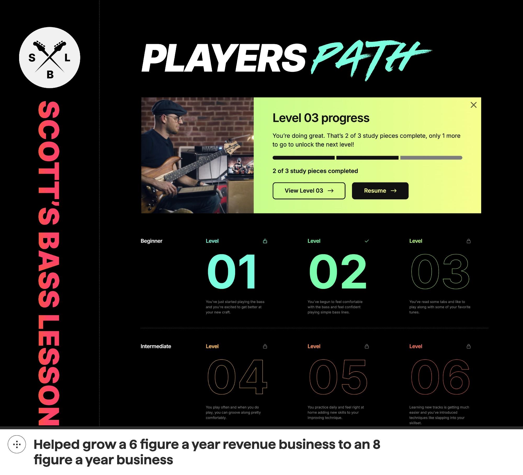 A composition of selected elements from the “Scott’s Bass Lessons” website, highlighting the “Players Path” feature. It includes a progress tracker, skill levels from beginner to advanced, and a sidebar with the brand logo and name. The caption reads “Helped grow a 6 figure a year revenue business to an 8 figure a year business”