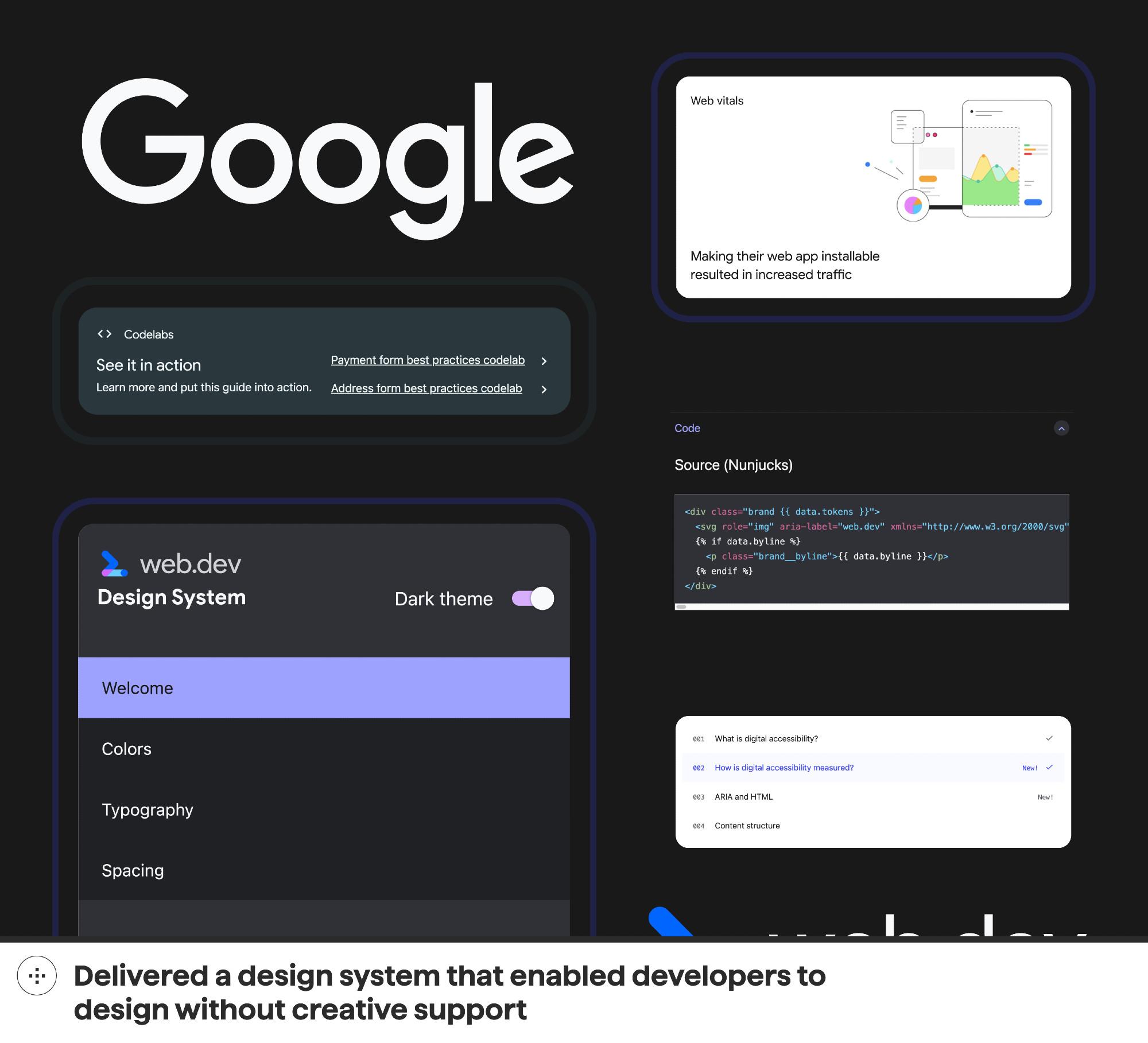 A composition of selected elements from the “web.dev” website by Google, showcasing its design system, web vitals insights, code examples, and accessibility guidelines. The layout features a dark theme with a modern interface. The caption reads “Helped grow a 6 figure a year revenue business to an 8 figure a year business”