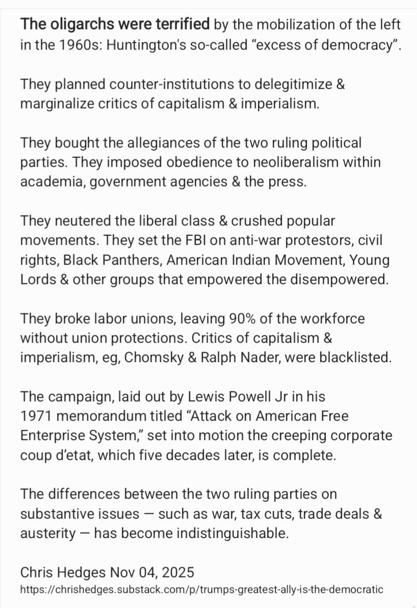 The oligarchs were terrified by the mobilization of the left in the 1960s: Huntington's so-called “excess of democracy”. They planned counter-institutions to delegitimize & marginalize critics of capitalism & imperialism. They bought the allegiances of the two ruling political parties. They imposed obedience to neoliberalism within academia, government agencies & the press. They neutered the liberal class & crushed popular movements. They set the FBI on anti-war protestors, civil rights, Black Panthers, American Indian Movement, Young Lords & other groups that empowered the disempowered. They broke labor unions, leaving 90% of the workforce without union protections. Critics of capitalism & imperialism, eg, Chomsky & Ralph Nader, were blacklisted. The campaign, laid out by Lewis Powell Jr in his 1971 memorandum titled “Attack on American Free Enterprise System,” set into motion the creeping corporate coup d'etat, which five decades later, is complete. The differences between the two ruling parties on substantive issues — such as war, tax cuts, trade deals & austerity — has become indistinguishable. Chris Hedges Nov 04, 2025 https://chrishedges.substack.com/p/trumps-greatest-ally-is-the-democratic
