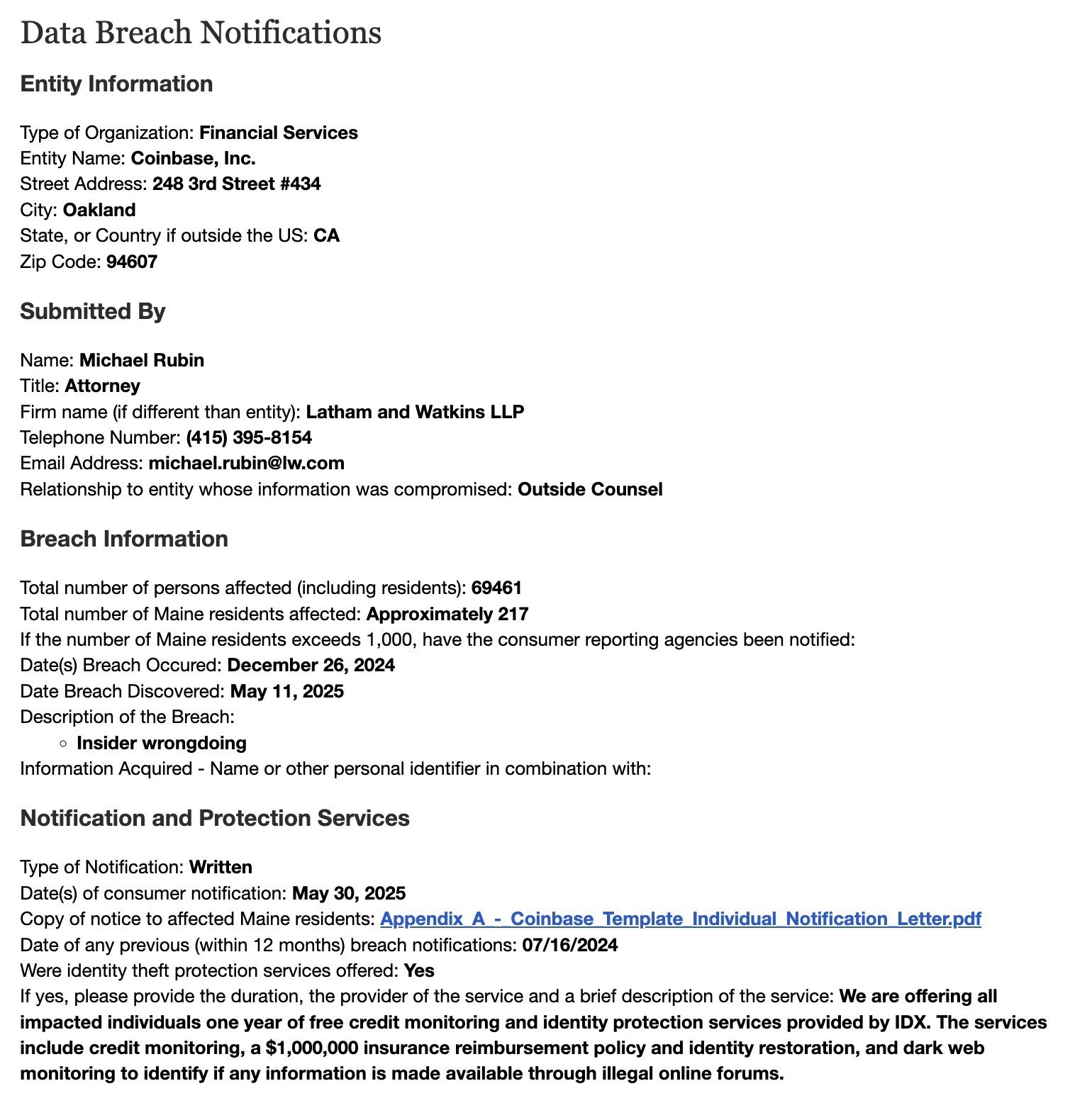 A Coinbase data breach filing with the Maine Attorney General finally gives us some more detail than Coinbase’s vague “less than 1% of monthly transacting users”. 69,461 people were affected, and Coinbase says the data breach occurred on December 26, 2024.