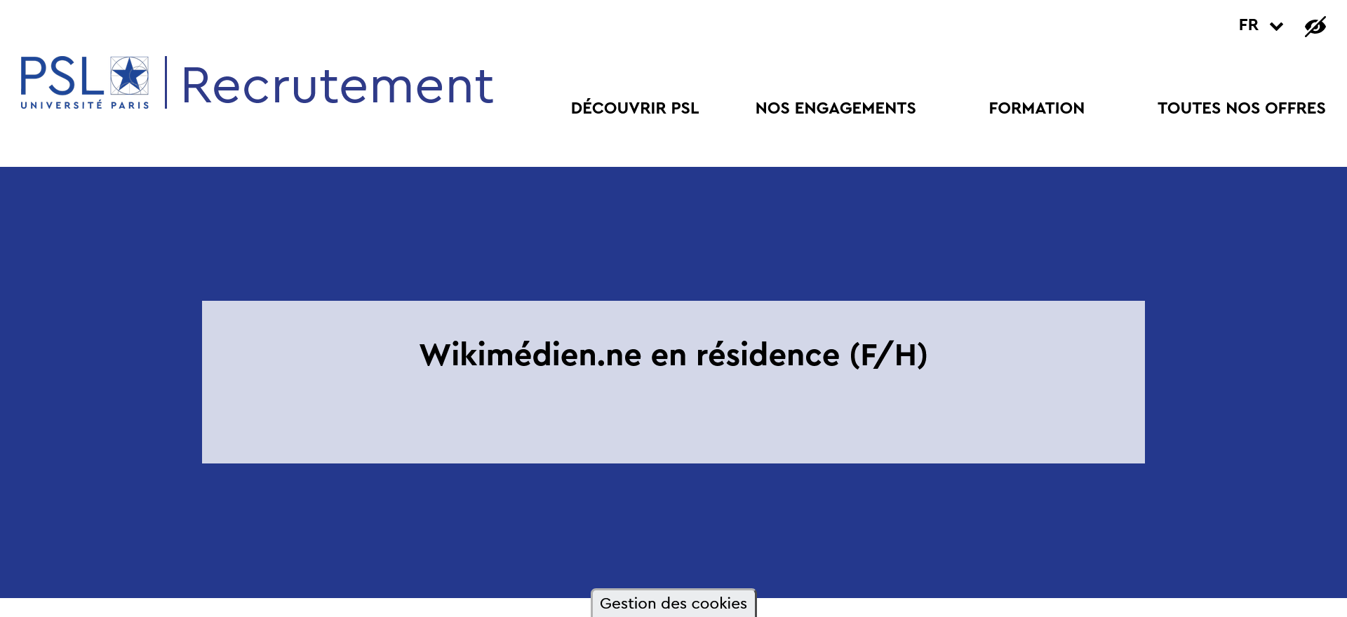 #Wikijob : une nouvelle résidence #Wikimédia à l' #Urfist de Paris, rattachée administrativement à l'École des chartes. Suite au bilan des 6 autres résidences au sein des Urfist, le CDD est allongé (18 mois). https://recrutement.psl.eu/nqlg3bbyqx #PSL #EcoleDesChartes