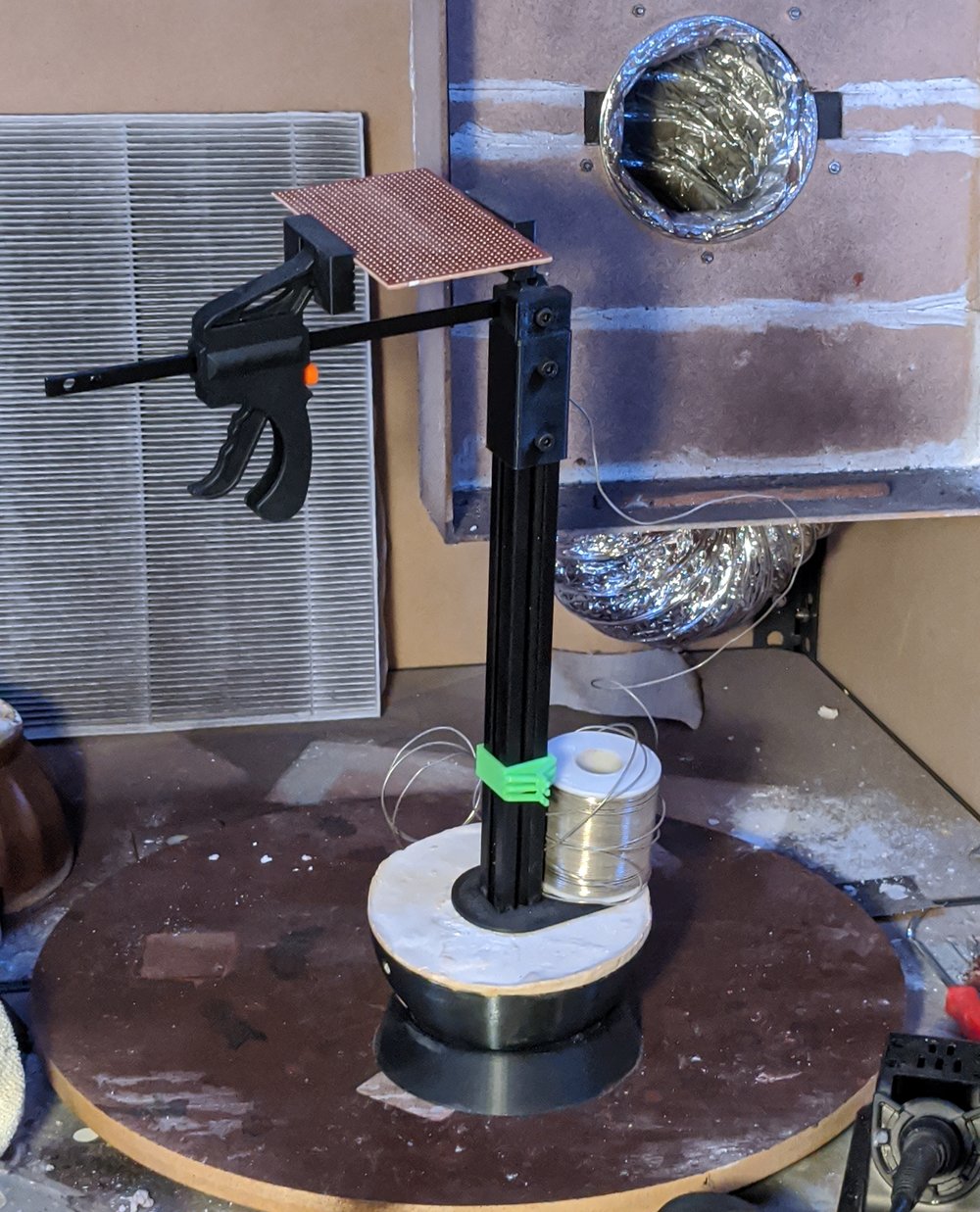 I ended up making my idea for the soldering clamp! It's super easy to clamp/unclamp/reposition with one hand, can do basically any angle, and anything at risk of being melted by the soldering iron can be reprinted.