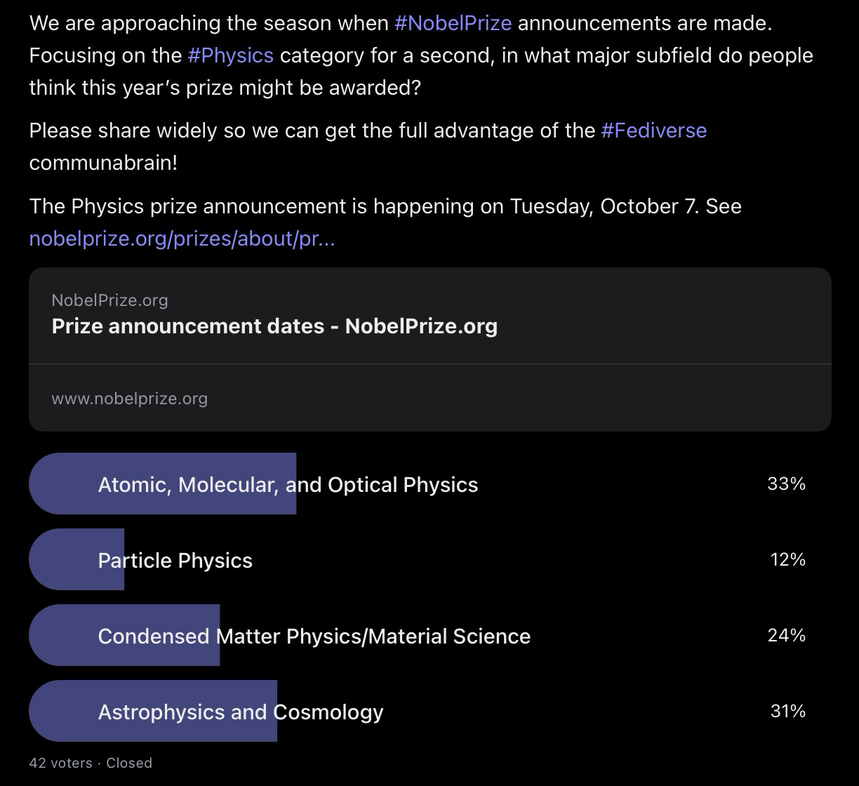 OK, so the results from my very unscientific #NobelPrize in #Physics topic poll are in, and the winner is … Atomic, Molecular, and Optical Physics (or “AMO”, as it’s short-handed). Hot on the heels of AMO is Astrophysics and Cosmology. Particle Physics was the hands-down least-favoured topic.
