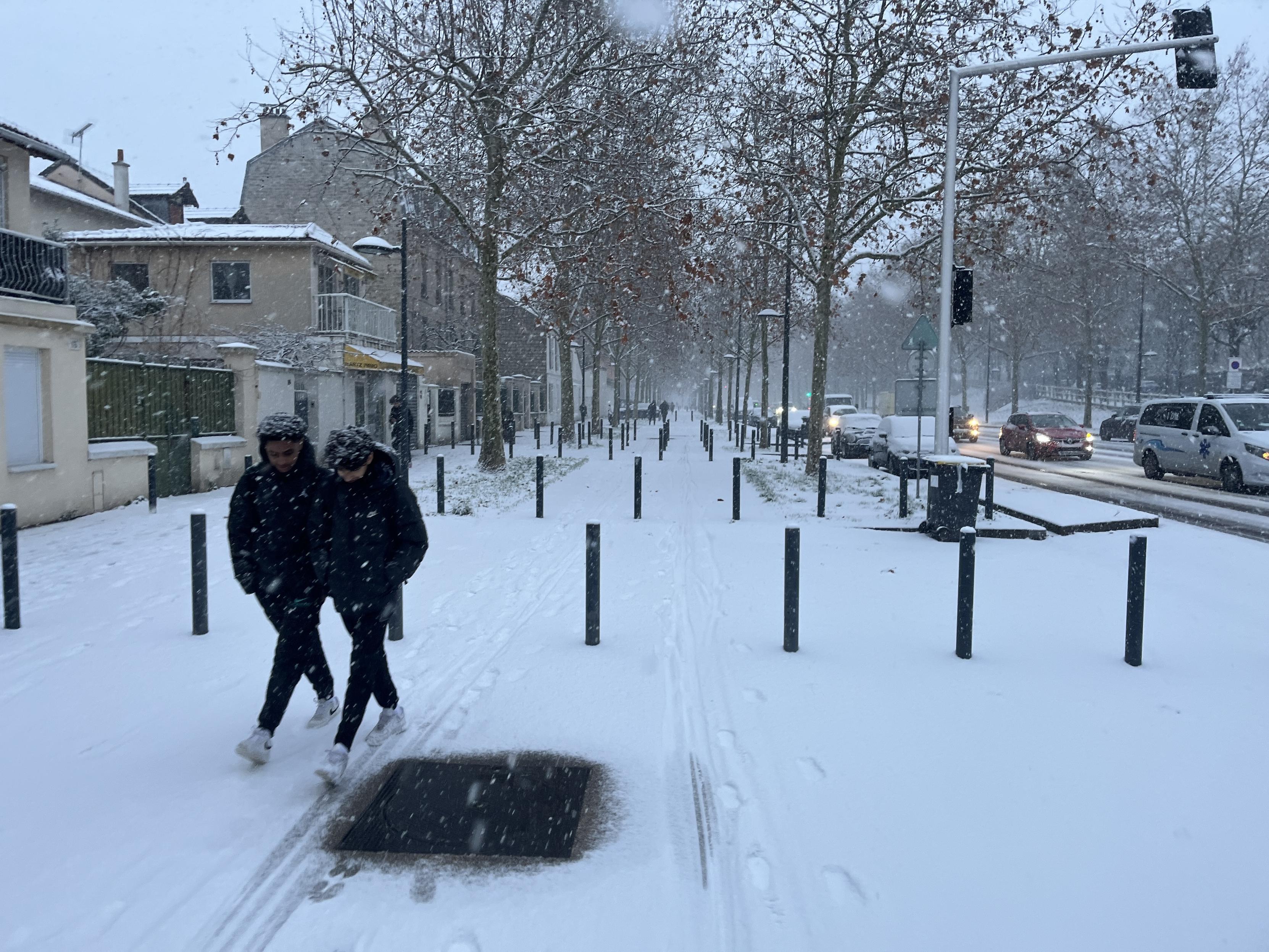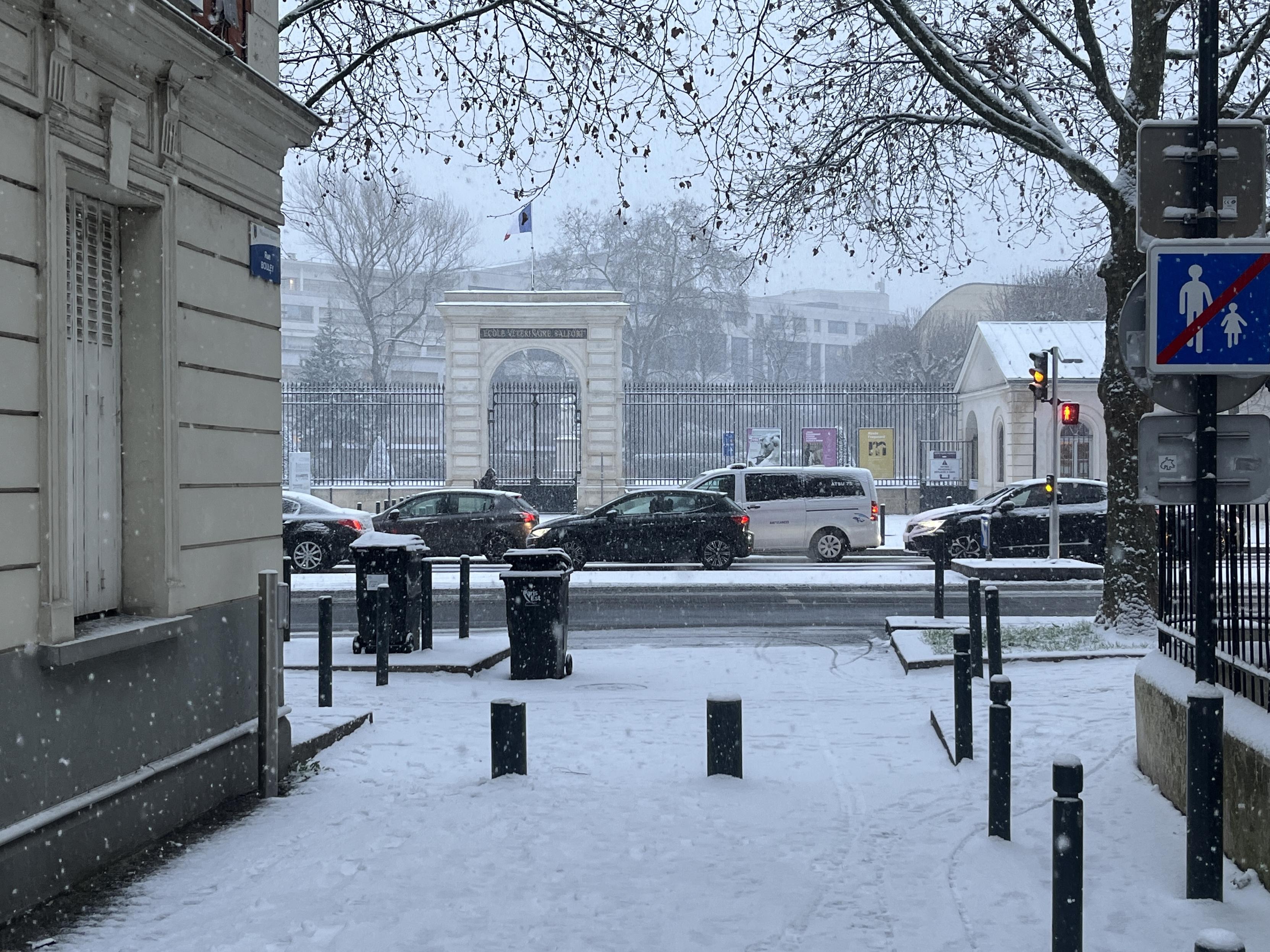 Les braves cyclistes sous la neige. Bd Arago, Paris 14ème.