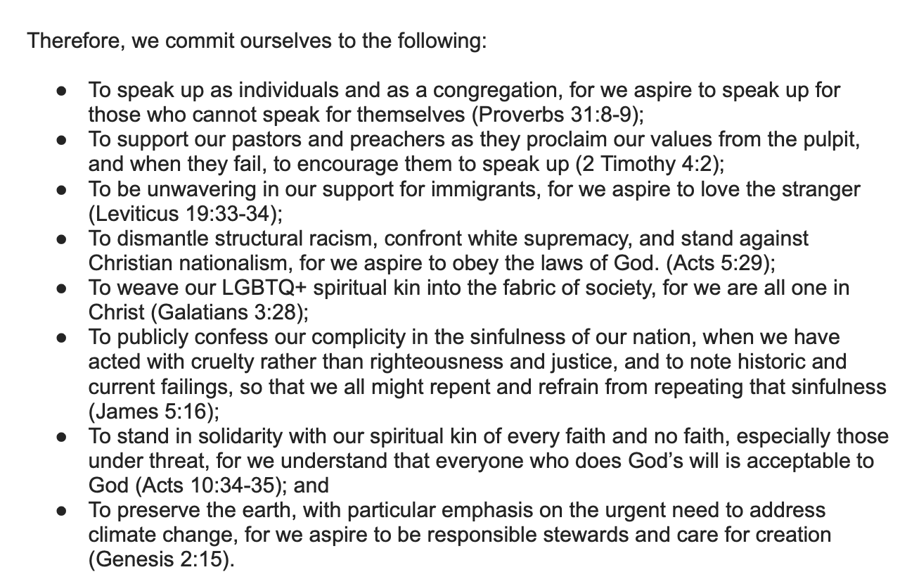 Therefore, we commit ourselves to the following: ● To speak up as individuals and as a congregation, for we aspire to speak up for those who cannot speak for themselves (Proverbs 31:8-9); ● To support our pastors and preachers as they proclaim our values from the pulpit, and when they fail, to encourage them to speak up (2 Timothy 4:2); ● To be unwavering in our support for immigrants, for we aspire to love the stranger (Leviticus 19:33-34); ● To dismantle structural racism, confront white supremacy, and stand against Christian nationalism, for we aspire to obey the laws of God. (Acts 5:29); ● To weave our LGBTQ+ spiritual kin into the fabric of society, for we are all one in Christ (Galatians 3:28); ● To publicly confess our complicity in the sinfulness of our nation, when we have acted with cruelty rather than righteousness and justice, and to note historic and current failings, so that we all might repent and refrain from repeating that sinfulness (James 5:16); ● To stand in solidarity with our spiritual kin of every faith and no faith, especially those under threat, for we understand that everyone who does God’s will is acceptable to God (Acts 10:34-35); and ● To preserve the earth, with particular emphasis on the urgent need to address climate change, for we aspire to be responsible stewards and care for creation (Genesis 2:15).