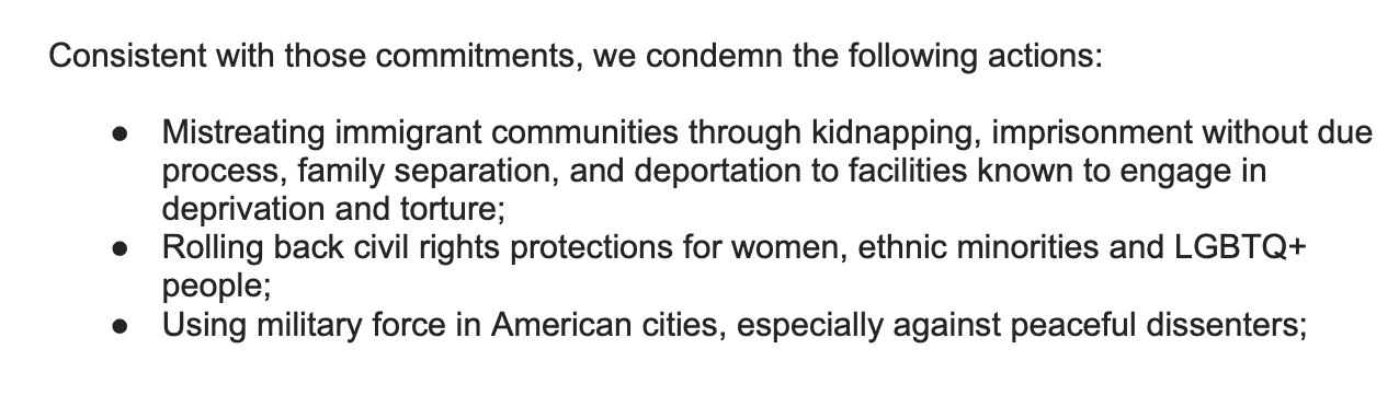 Consistent with those commitments, we condemn the following actions: ● Mistreating immigrant communities through kidnapping, imprisonment without due process, family separation, and deportation to facilities known to engage in deprivation and torture; ● Rolling back civil rights protections for women, ethnic minorities and LGBTQ+ people; ● Using military force in American cities, especially against peaceful dissenters;