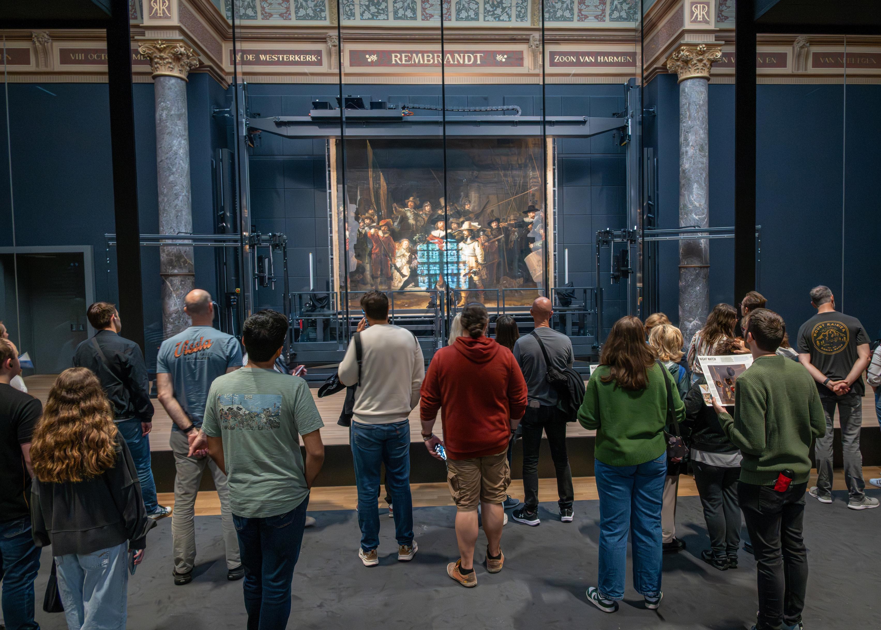 Visitors looking at Rembrandt's "The Night Watch" at the Rijksmuseum in Amsterdam. It's in the process of being restored, protected by a soundproof glass enclosure to avoid disturbing the restorers, who work on the powered gantry visible inside. One of the docents provided a lot of great background on the processes they're using.