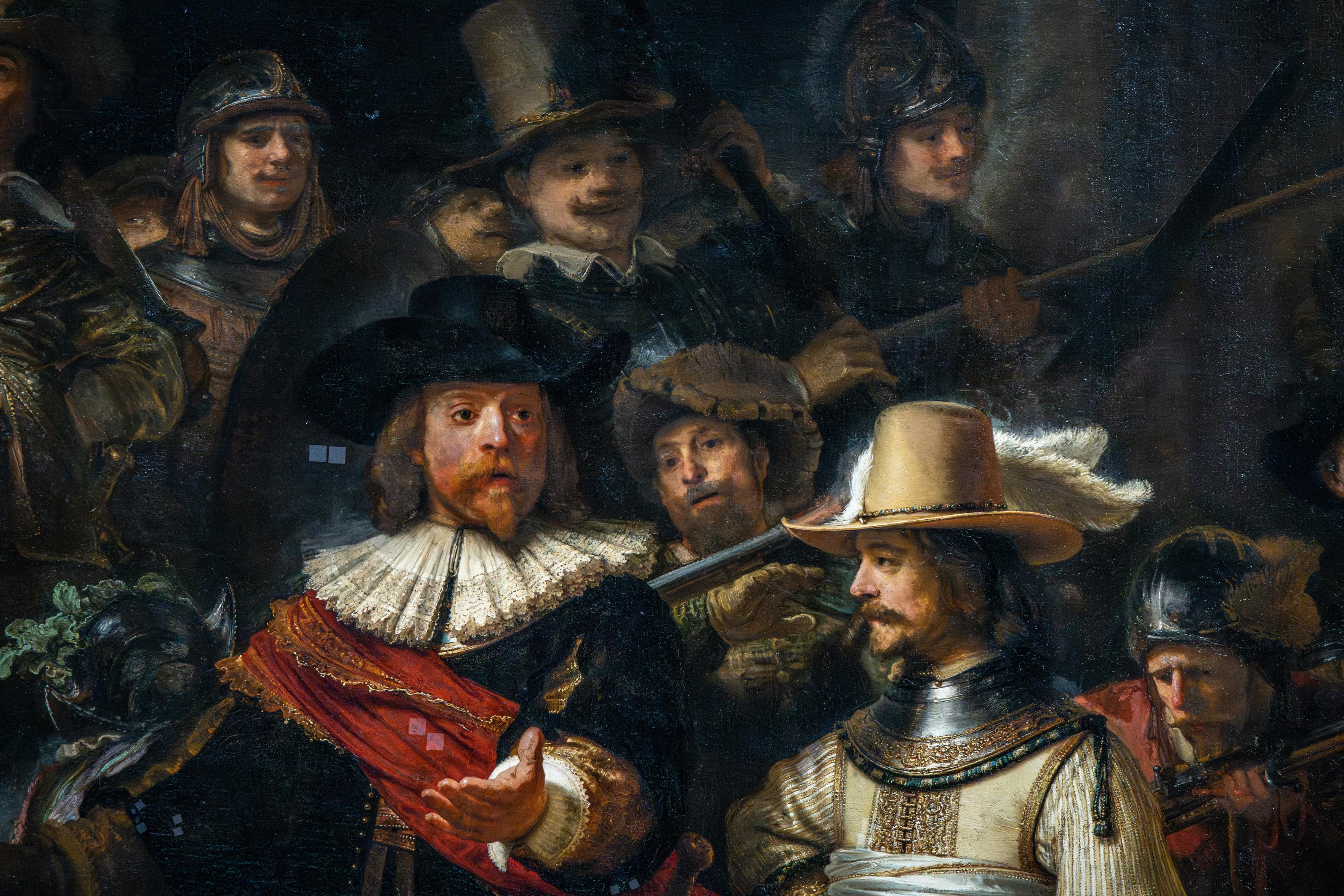 Detail of Rembrandt's "The Night Watch" at the Rijksmuseum in Amsterdam. The two rectangular spots are where some of the varnish has been removed as part of the research for the current restoration work. Rembrandt painted himself into the scene; that's him peering over the shoulder of the helmeted watchman in the upper left.