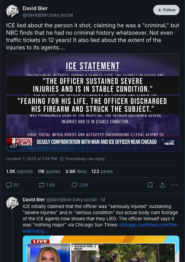 "ICE lied about the person it shot, claiming he was a "criminal," but NBC finds that he had no criminal history whatsoever. Not even traffic tickets in 12 years! It also lied about the extent of the injuries to its agents"