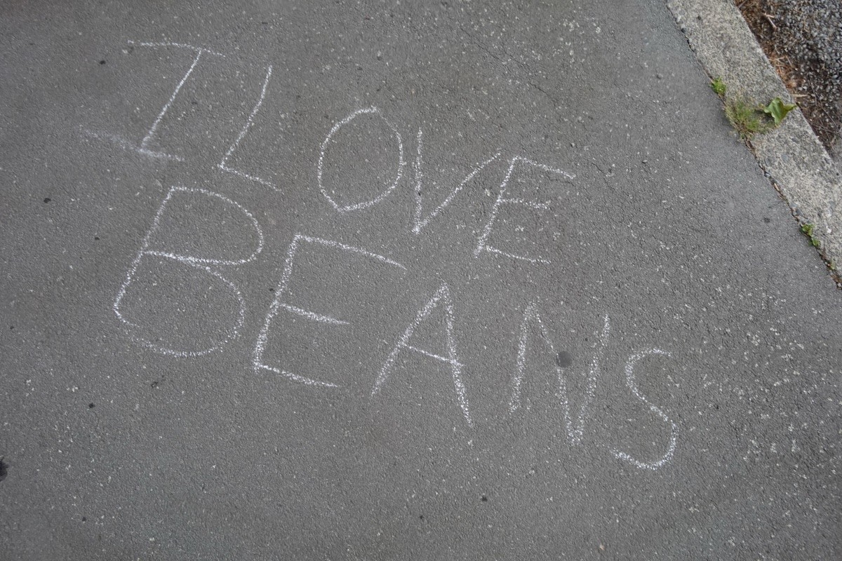 Then, today, I was out on the streets of Christchurch and I saw a message someone had written in chalk on the footpath (sidewalk): "I LOVE BEANS".