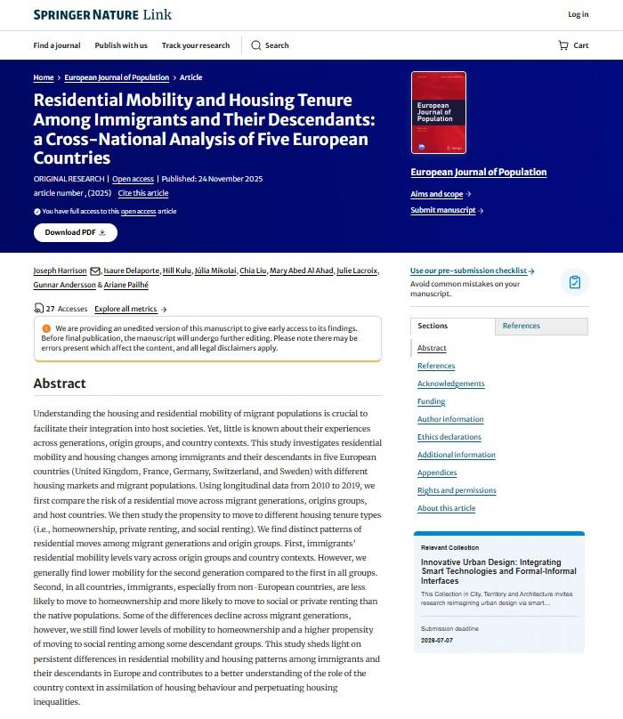 Image shows front cover of European Journal of Population article: "Residential Mobility and Housing Tenure Among Immigrants and Their Descendants: a Cross-National Analysis of Five European Countries" Open access, Published: 24 November 2025 Authors: Joseph Harrison, Isaure Delaporte, Hill Kulu, Júlia Mikolai, Chia Liu, Mary Abed Al Ahad, Julie Lacroix, Gunnar Andersson & Ariane Pailhé. Abstract: Understanding the housing and residential mobility of migrant populations is crucial to facilitate their integration into host societies. Yet, little is known about their experiences across generations, origin groups, and country contexts. This study investigates residential mobility and housing changes among immigrants and their descendants in five European countries (United Kingdom, France, Germany, Switzerland, and Sweden) with different housing markets and migrant populations. Using longitudinal data from 2010 to 2019, we first compare the risk of a residential move across migrant generations, origins groups, and host countries. We then study the propensity to move to different housing tenure types (i.e., homeownership, private renting, and social renting). We find distinct patterns of residential moves among migrant generations and origin groups. First, immigrants’ residential mobility levels vary across origin groups and country contexts. However, we generally find lower mobility for the second generation compared to the first in all groups...