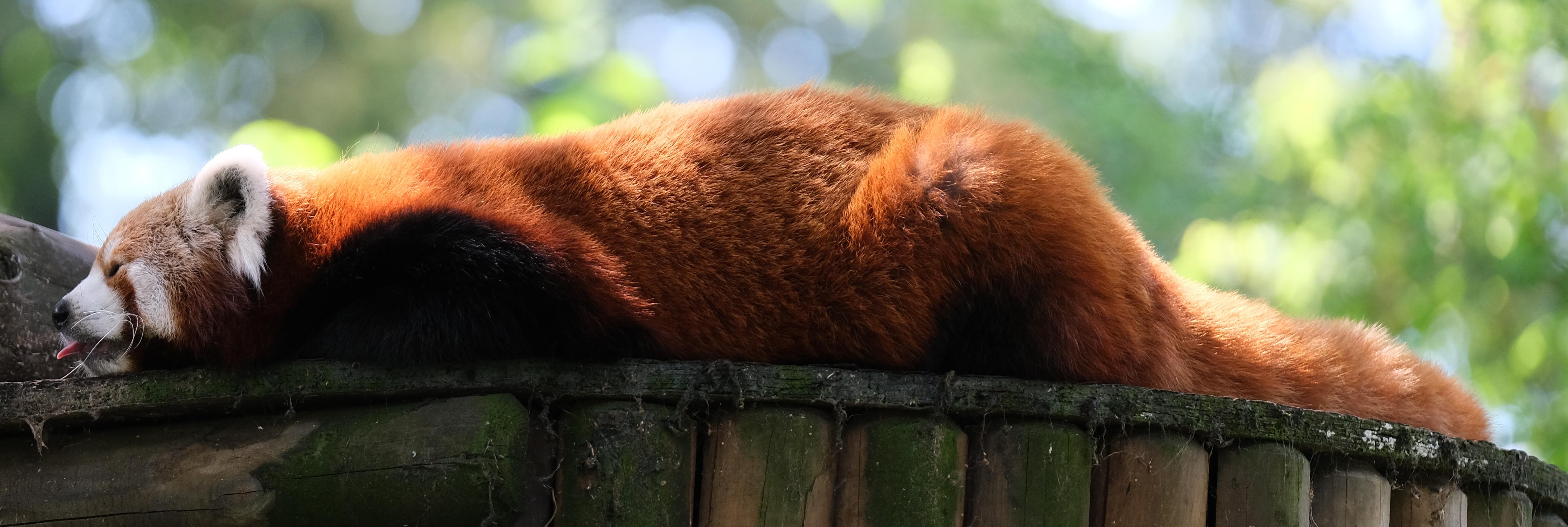A close-up of a red panda up in a tree. It was a very hot day, and the panda has its tongue sticking out, lightly panting to control temperature.