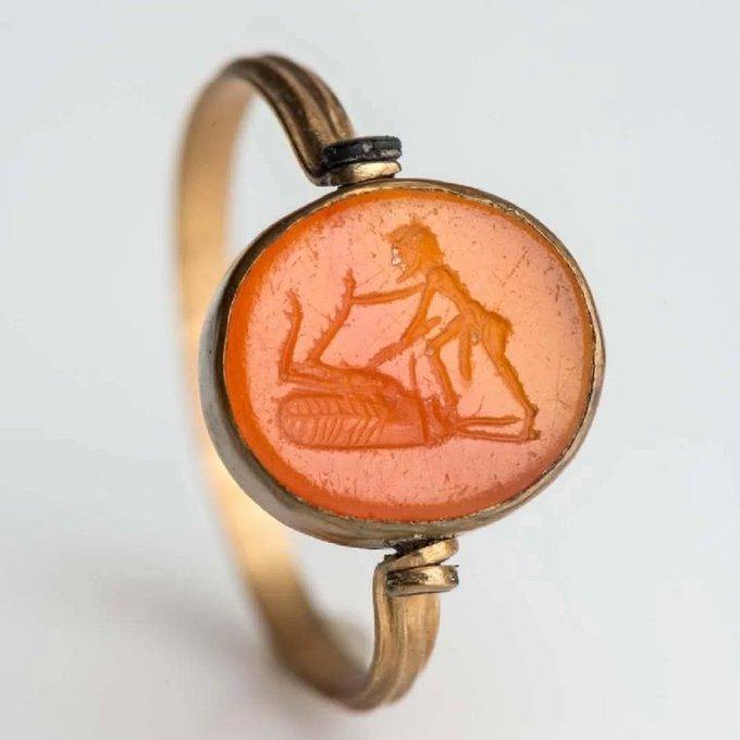 Roman Intaglio ring carved from carnelian, depicting a dwarf killing a grasshopper (1st Century BC) ....