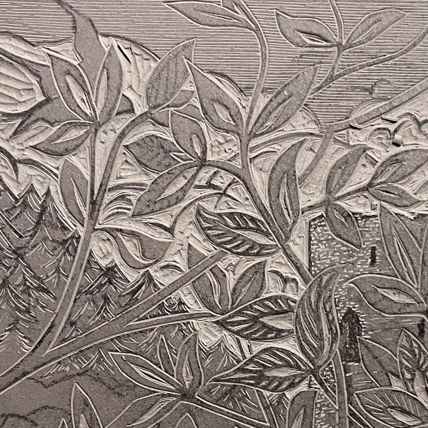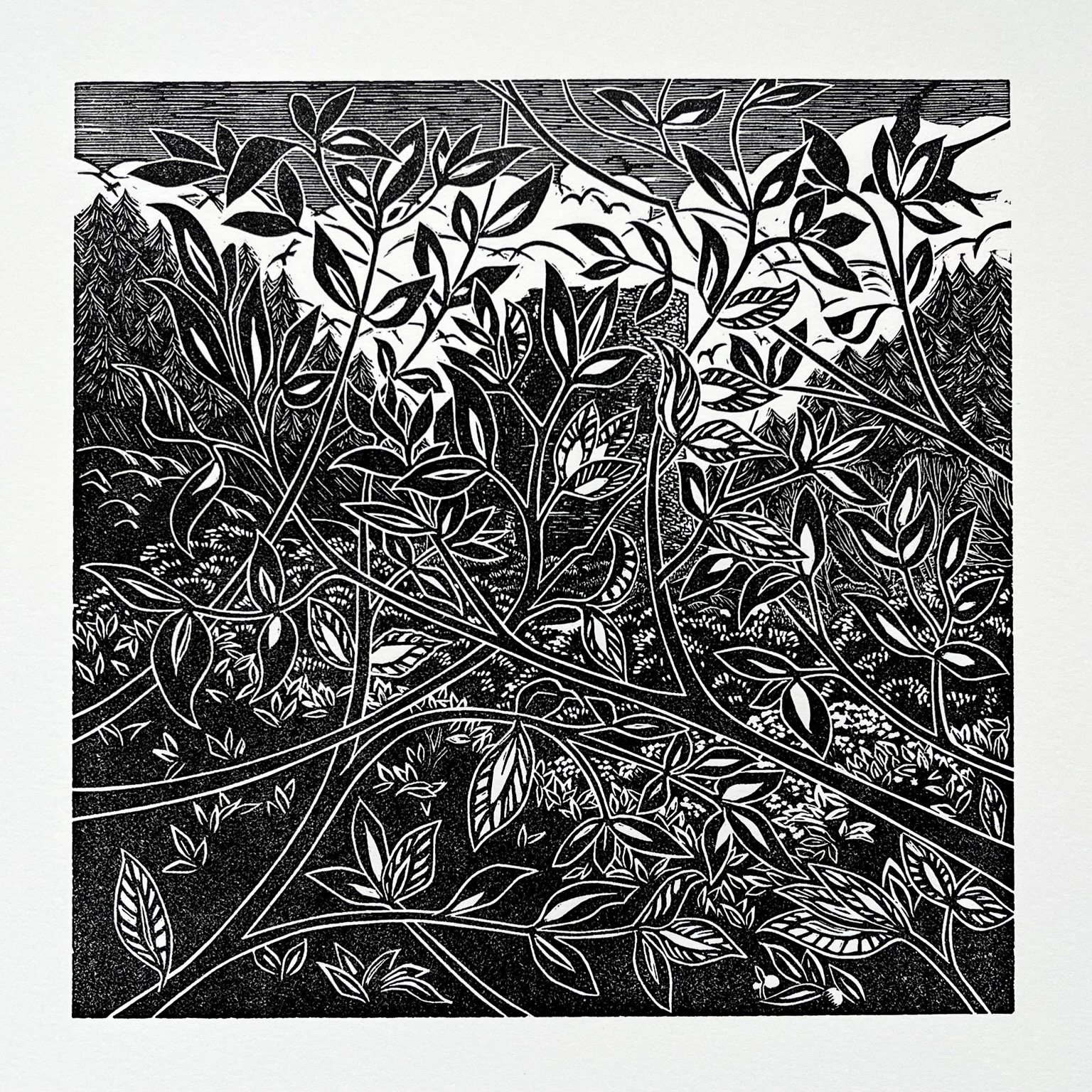 Detail from a linocut work in progress. This is a block I abandoned a year or so back and came upon last week. It’s one of those ‘let’s see what happens pieces’ and I’m enjoying playing with it. Hoping to proof it next week before deciding where to go with foreground (not in this picture).