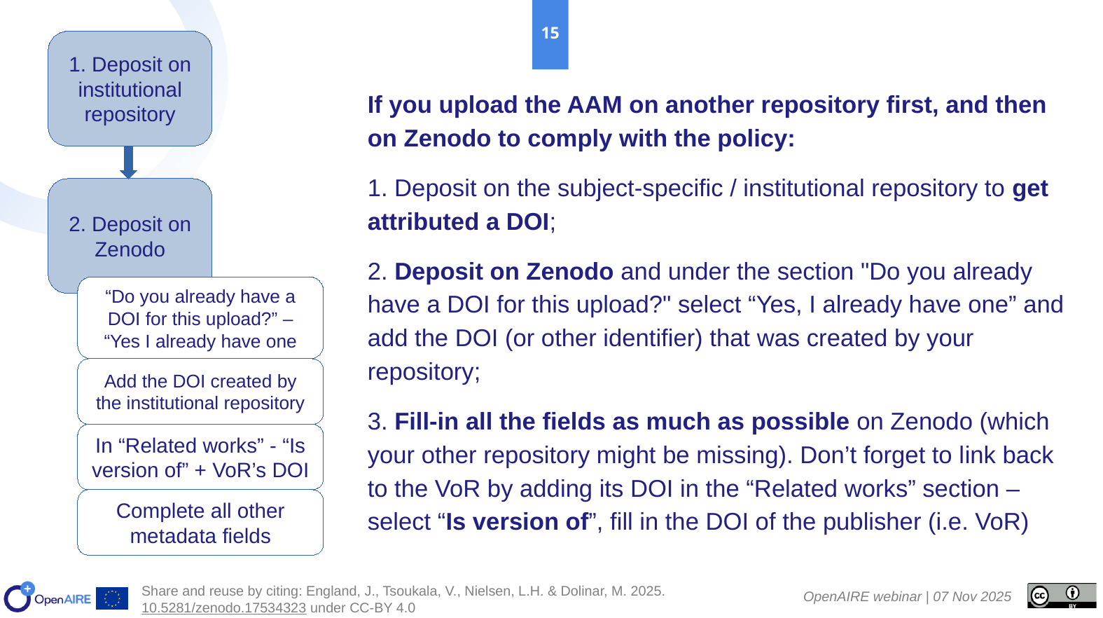 To comply with the Open Access to publications requirements in Horizon Europe, you need to upload a version of your manuscript on a trusted and ready-for-compliance repository. In doubt upload on Zenodo, which is compliant. If you upload the Author Accepted Manuscript on another repository first, and then on Zenodo to comply with the policy: (1) Deposit on the subject-specific or institutional repository to get attributed a DOI; (2) Deposit on Zenodo and under the section "Do you already have a DOI for this upload?" select "Yes, I already have one" and add the DOI created by your repository; (3) Fill-in all the fields as much as possible on Zenodo; (4) Don't forget to link back to the Version of Record by adding its DOI in the "Related works" section, select "Is version of", and fill-in the DOI of the publisher.