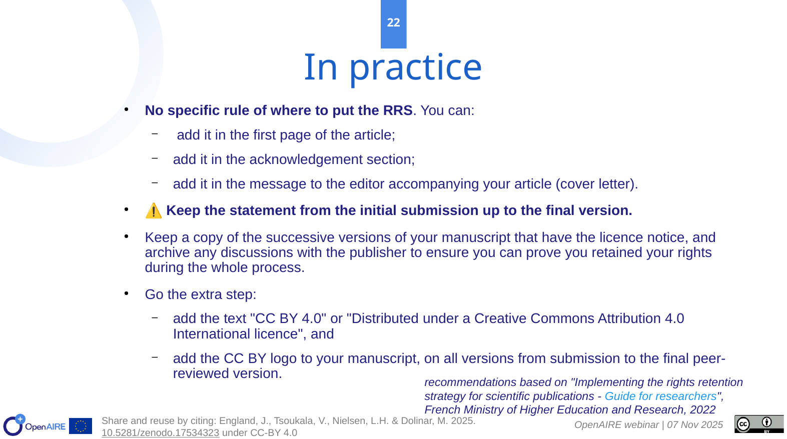 There is no specific rule of where to put the Rights Retention Statement. You can: (1) add it in the first page of the article; (2) add it in the acknowledgment section; (3) add it in the message to the editor accompanying your article (cover letter). Keep the statement from the initial submission up to the final version. Keep a copy of the succsessive versions of your manuscript that have the licence notice, and achive any discusssion with the publisher to ensure you can prove you retained your rights during the whole process. Go the extra step: (1) add the text "CC BY 4.0" or "Distributed under a Creative Commons Attribution 4.0 International Licence"; and (2) add the CC BY logo to your manuscript on all versions, from submission to the final peer-reviewed version. Recommendations based on "Implementing the rights retention strategy to scientific publications - Guide to researchers" from the French Ministy of Higher Education and Research (2022)