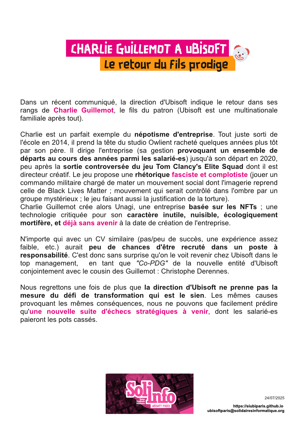 Dans un récent communiqué, la direction d’Ubisoft indique le retour dans ses rangs de Charlie Guillemot, le fils du patron. C'est un parfait exemple du népotisme d’entreprise. Tout juste sorti de l’école en 2014, il prend la tête du studio Owlient racheté quelques années plus tôt par son père. Sa gestion provoquant un ensemble de départs au cours des années parmi les salariés jusqu’à son départ en 2020, peu après la sortie controversée du jeu Tom Clancy’s Elite Squad dont il est directeur créatif. Le jeu propose une rhétorique fasciste et complotiste (jouer un commando militaire chargé de mater un mouvement social dont l’imagerie reprend celle de Black Lives Matter). Charlie Guillemot crée alors Unagi, une entreprise basée sur les NFTs ; une technologie critiquée pour son caractère inutile, nuisible et déjà sans avenir à la date de création de l’entreprise. N’importe qui avec un CV similaire aurait peu de chances d’être recruté dans un poste à responsabilité. C’est donc sans surprise qu’on le voit revenir chez Ubisoft dans le top management, en tant que “Co-PDG” de la nouvelle entité d’Ubisoft conjointement avec le cousin des Guillemot : Christophe Derennes. Nous regrettons une fois de plus que la direction d’Ubisoft ne prenne pas la mesure du défi de transformation qui est le sien. Les mêmes causes provoquant les mêmes conséquences, nous ne pouvons que facilement prédire qu’une nouvelle suite d’échecs stratégiques à venir, dont les salariés paieront les pots cassés.