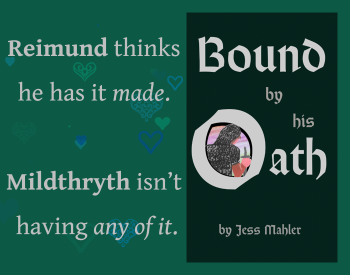 Text and book cover on green background. On the left it reads: Remind thinks  he has it made. Mildthryth isn't having any of it.  On the right is book cover, grey text on dark green background.  "Bound by his Oath by Jess Mahler"  The 'O' in 'Oath' is oversized. Inside it is a knight wearing chainmail, looking away from the viewer with head bowed and holding a reversed sword. Behind him is a sunset.