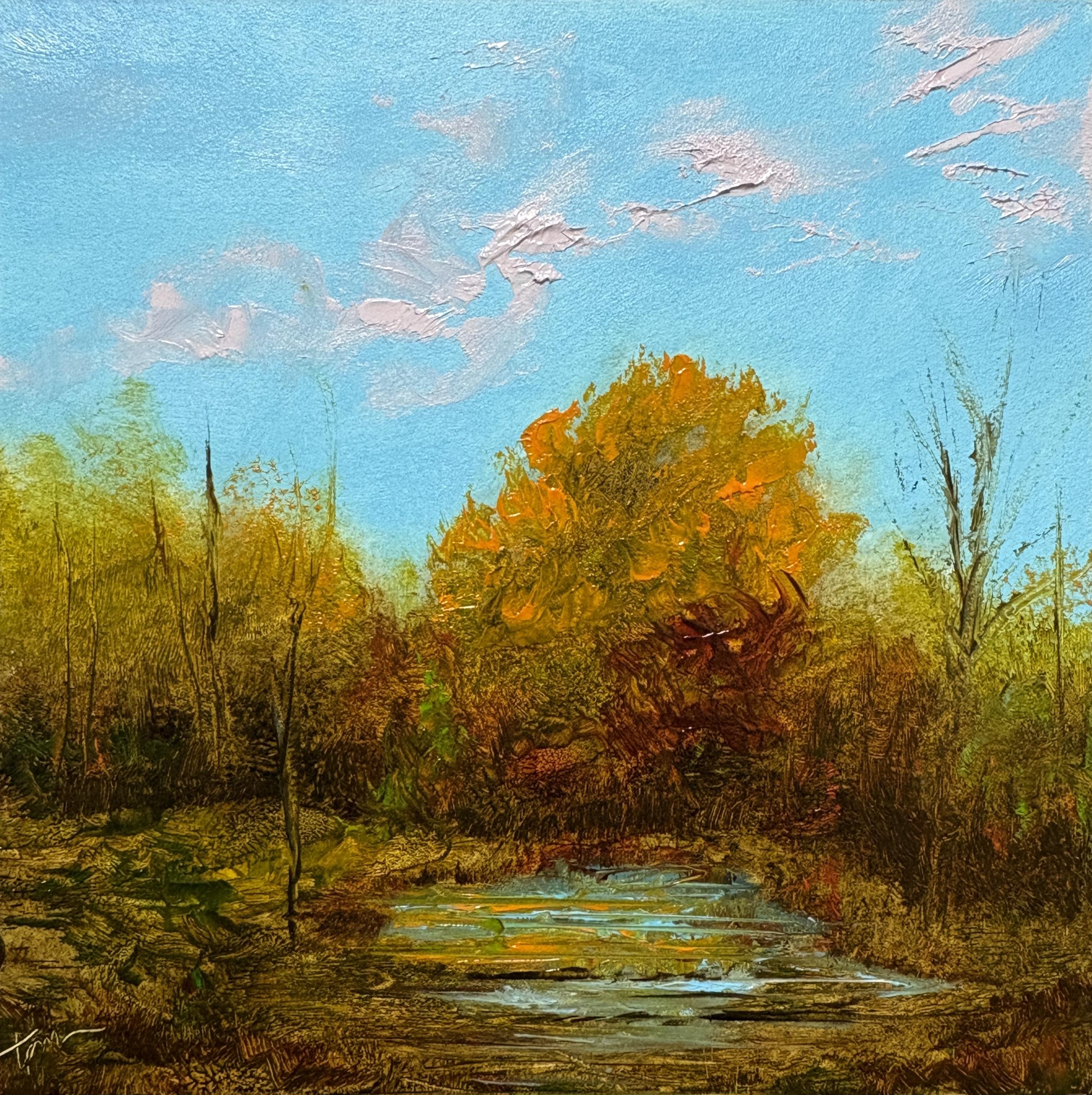 Tisha Mark ©2025, Golden Lights Marsh, oil on gessobord, 5"x5"