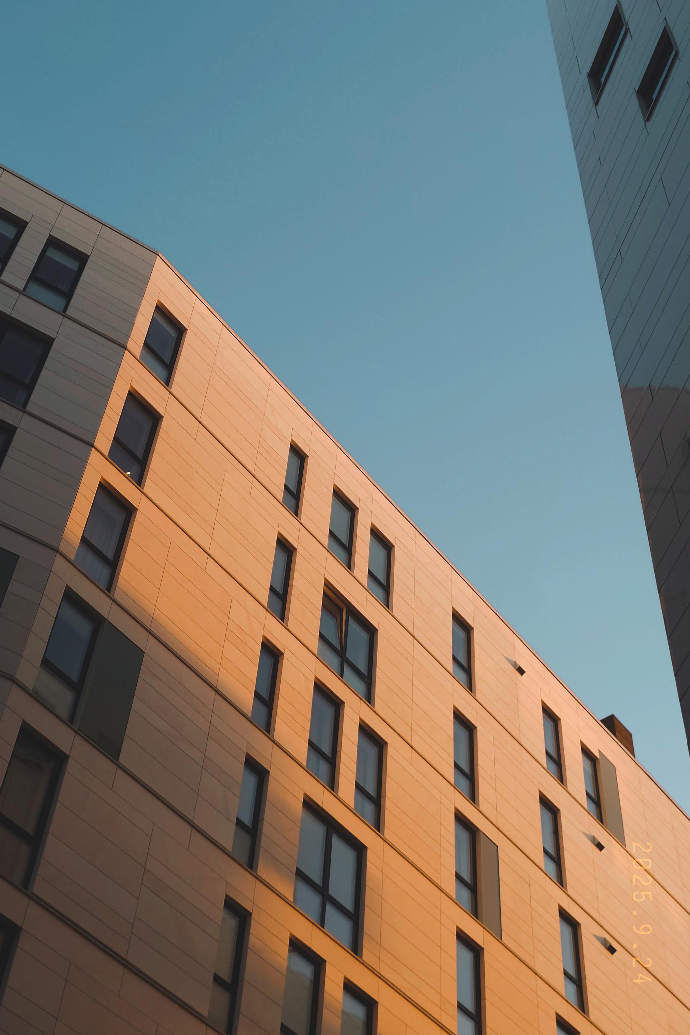 Photo of the light blue wall lit by the sunset. The window frame and the railings cast warm shadows on the wall.