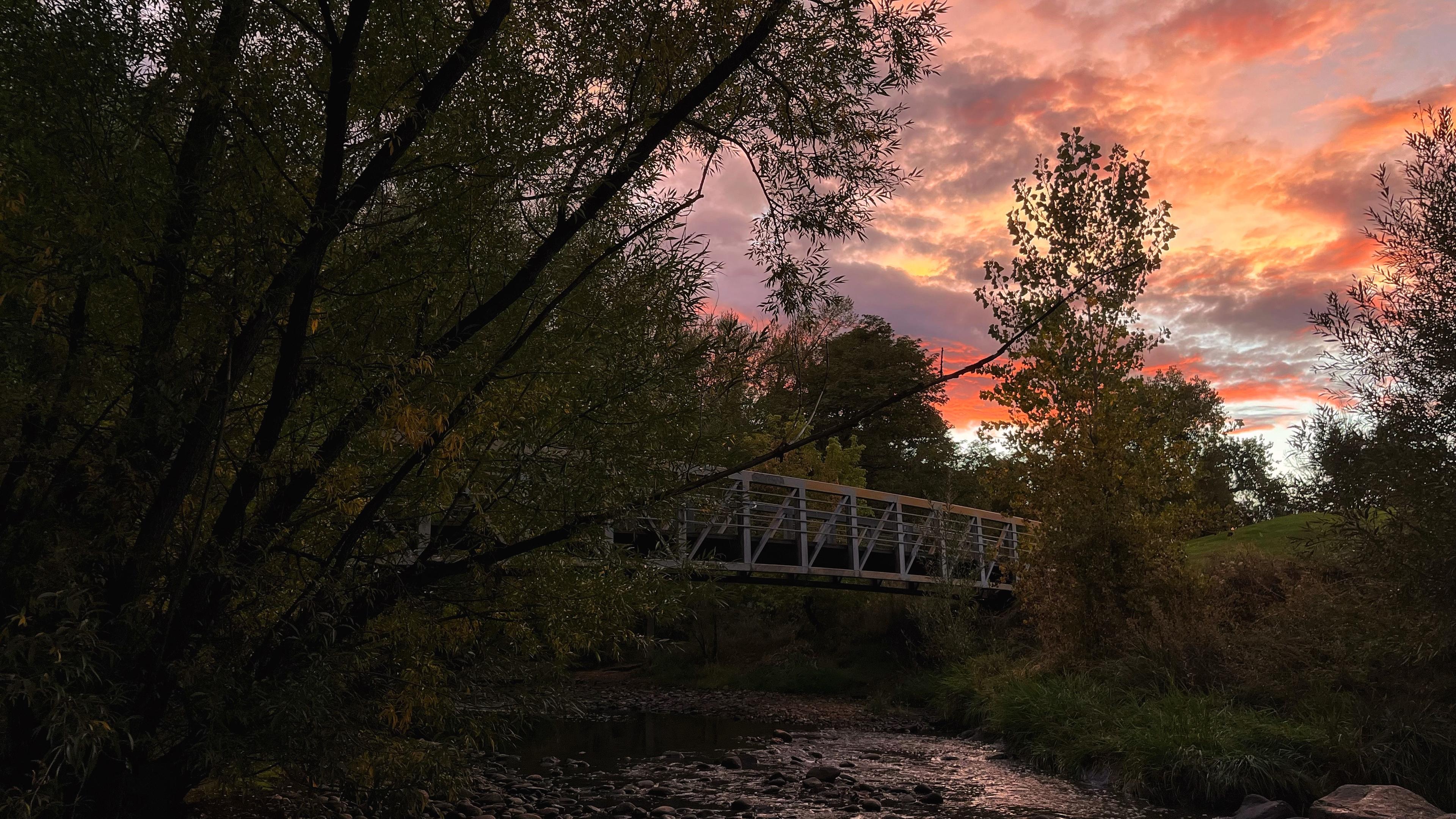 A creekside view of a rustic metal and wood pedestrian bridge crossing a shallow, rocky creek, with trees, shrubs, and grasses on both sides of the creek banks. The bridge, trees, and creek are almost dark silhouettes in the fading, post-sunset light. Above the bridge and trees, the skies are partly cloudy and reflecting the glowing colors of the sunset, painting the sky in shades of gold, orange, and red.