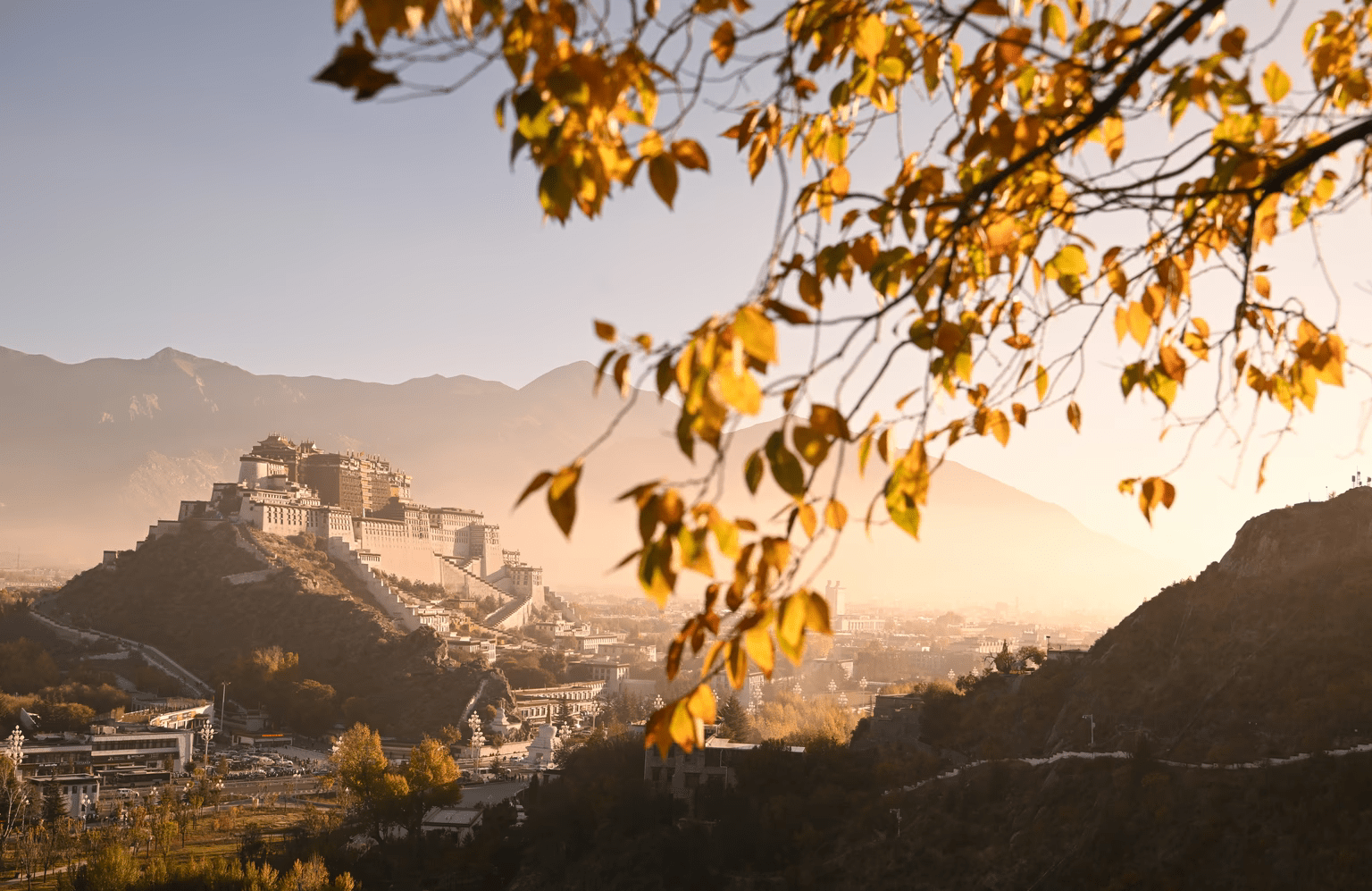 In the background, towering mountains rise against the horizon, their peaks partially covered in a light dusting of snow, adding a sense of grandeur and depth to the scene. The sky above is clear with a few scattered clouds, allowing the sunlight to bathe the landscape in a warm, golden glow.