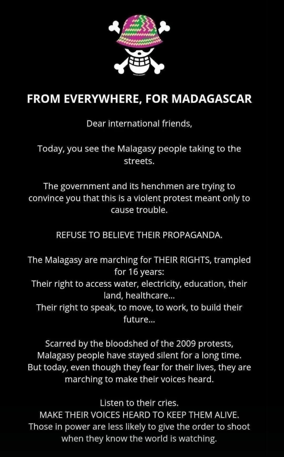 Proud of my #Malagasy friends who took to the streets of #Antananarivo yesterday, as their president #Rajoelina was making up facts at the UN convention about imaginary improved access to electricity. It is VERY heartwarming to see #GenZ follow in the steps of #Nepal, from the #Onepiece avatars to, I hope, a less corrupt government. There had been zero #hope for so long and & lack of organising. Hope the tiny middleclass in #Madagascar can bring about change.