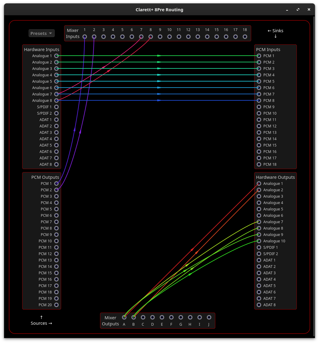 I switched to a #Focusrite Clarett+ 8Pre USB audio interface. So far things are running really smooth. The "ALSA Scarlett Control Panel" (https://github.com/geoffreybennett/alsa-scarlett-gui) is an amazing piece of software. It allows me to control the internal mixer, and all other features, I otherwise wouldn't have any access to. (1/3)