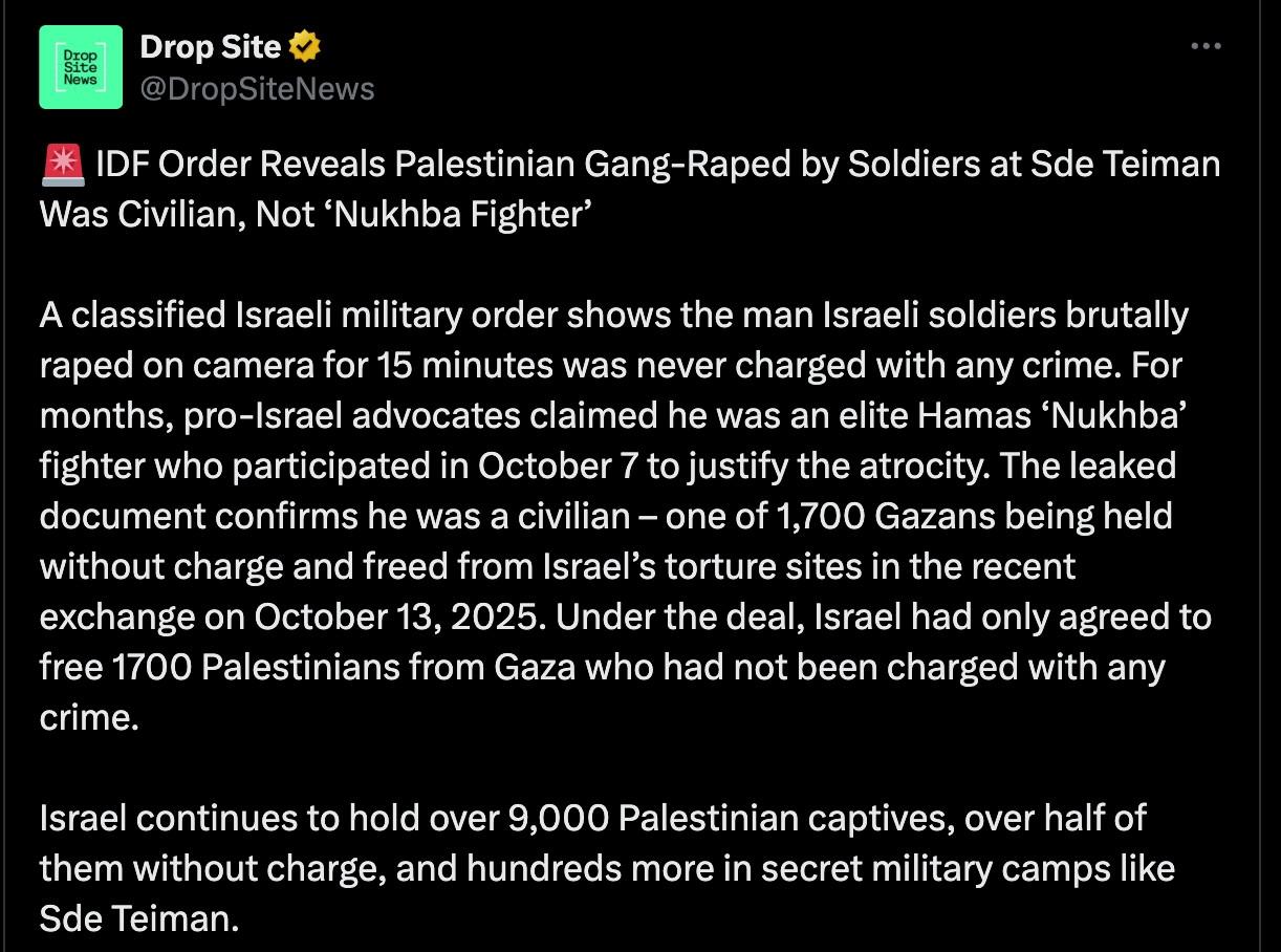 IDF Order Reveals Palestinian Gang-Raped by Soldiers at Sde Teiman Was Civilian, Not ‘Nukhba Fighter’ but an innocent civilian.