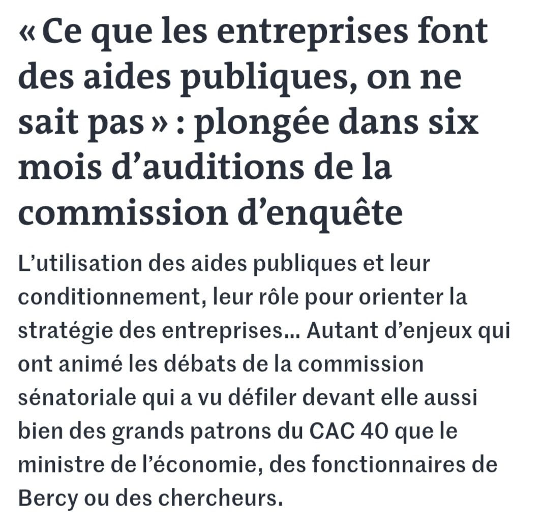 Article du Monde : « Ce que les entreprises font des aides publiques, on ne sait pas » : plongée dans six mois d'auditions de la commission d'enquête L'utilisation des aides publiques et leur conditionnement, leur rôle pour orienter la stratégie des entreprises… Autant d'enjeux qui ont animé les débats de la commission sénatoriale qui a vu défiler devant elle aussi bien des grands patrons du CAC 40 que le ministre de l'économie, des fonctionnaires de Bercy ou des chercheurs. https://www.lemonde.fr/economie/article/2025/07/02/ce-que-les-entreprises-font-des-aides-publiques-on-ne-sait-pas-plongee-dans-six-mois-d-auditions-de-la-commission-d-enquete_6617356_3234.html