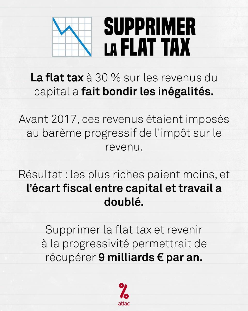 Visuel Attac : Supprimer la Flat Tax. La flat tax à 30% sur les revenus du capital a fait bondir les inégalités. Avant 2017, ces revenus étaient imposés au barème progressif de l'impôt sur le revenu. Résultat : les plus riches paient moins et l'écart fiscal entre capital et travail a doublé. Supprimer la flat tax et revenir à la progressivité permettrait de récupérer 9 milliards € par an.