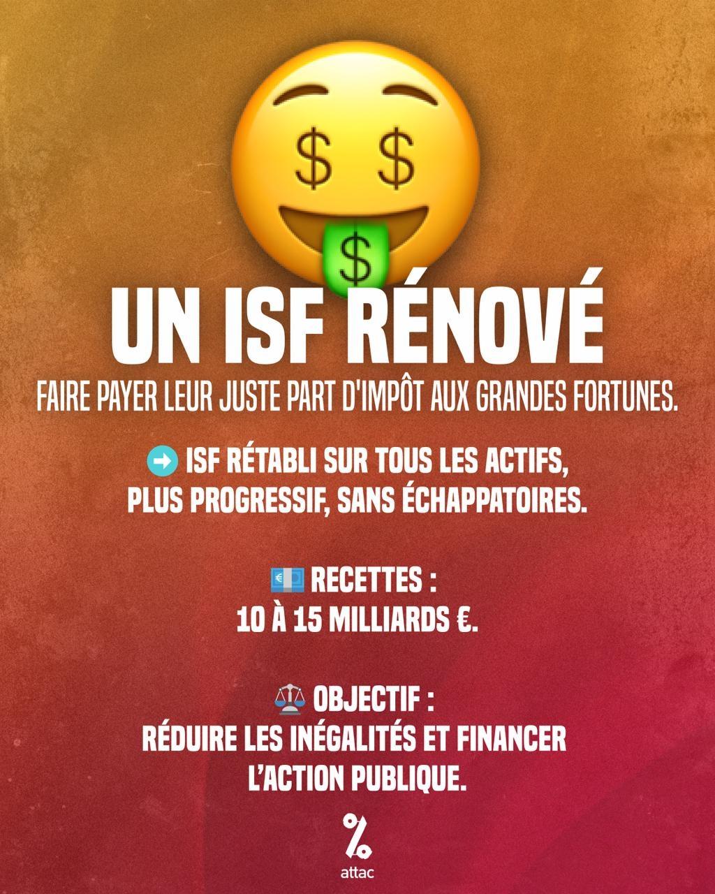 Visuel Attac : Un ISF rénové. Faire payer leur juste part d'impôt aux grandes fortunes. ISF rétabli sur tous les actif·ves, plus progressif, sans échappatoires. Recettes : 10 à 15 milliards € Objectif : réduire les inégalités et financer l'action publique.