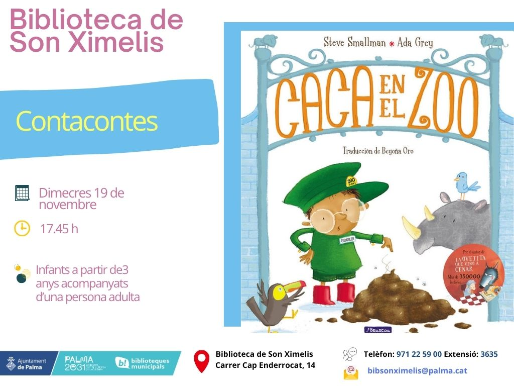 Cartell amb els detalls del contacontes. A la dreta, la portada del llibre amb una il·lustració.