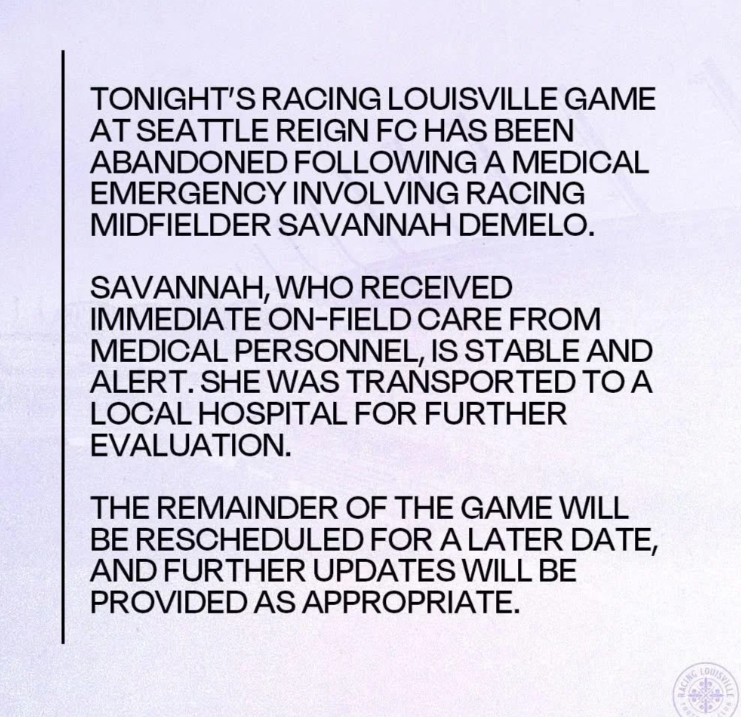 Savannah DeMelo is stable and alert, according to Racing Louisville