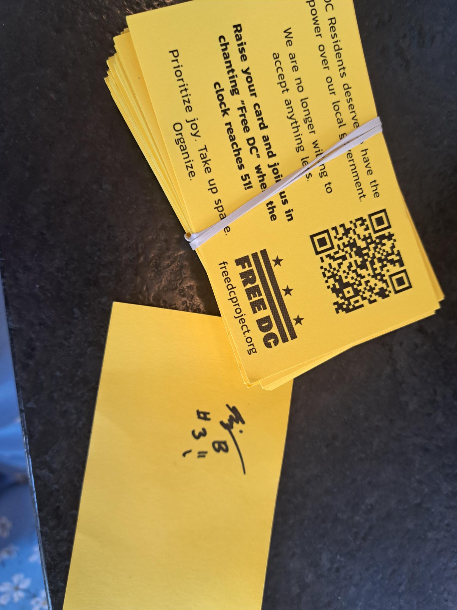 yellow cards with Free DC branding and messaging on a black table. one of the cards is flipped over with a signature on it