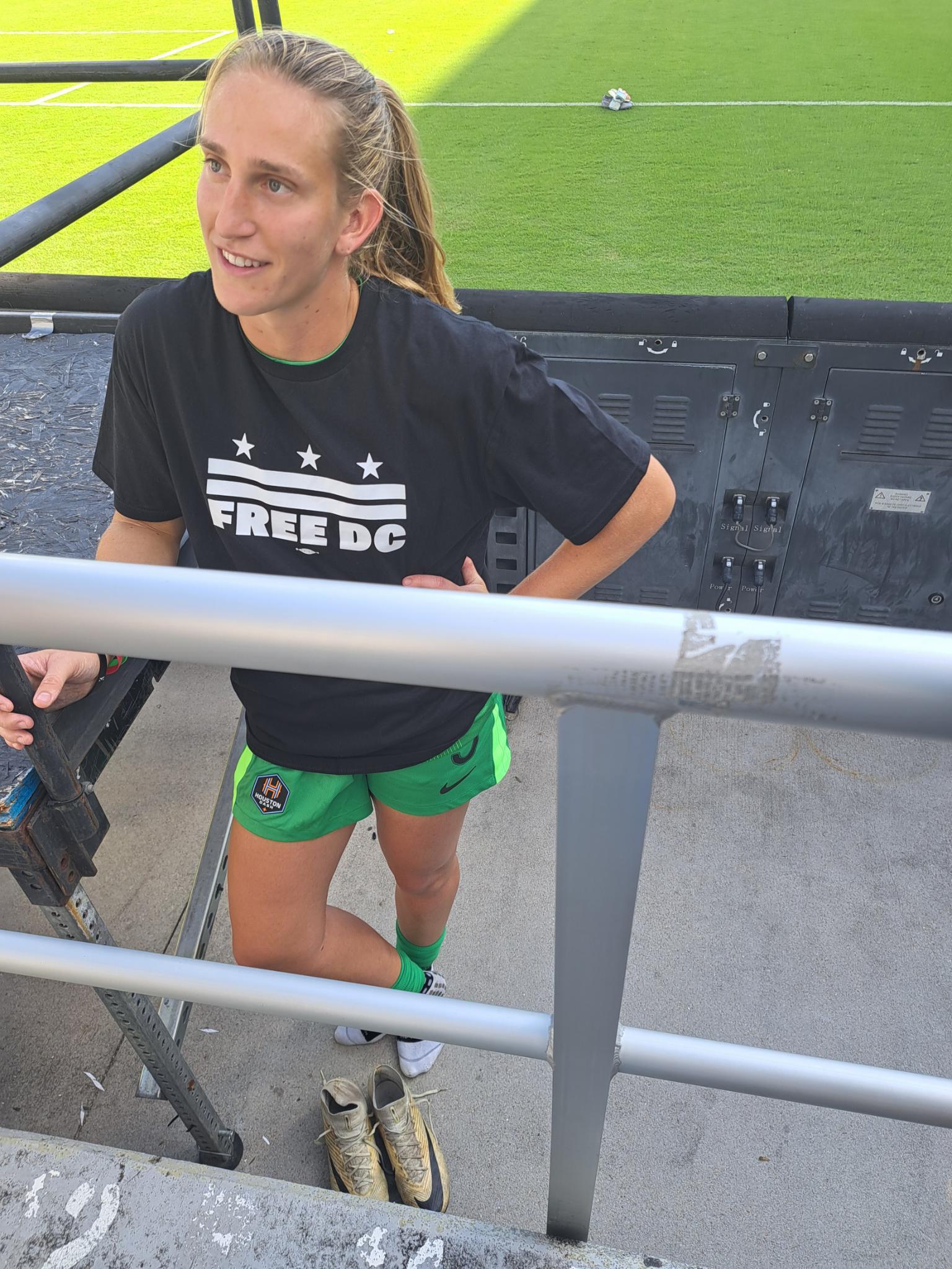 a tall blonde woman in a green goalkeeper kit with a black Free DC t-shirt over it. in the background is a soccer pitch with a soccer ball.